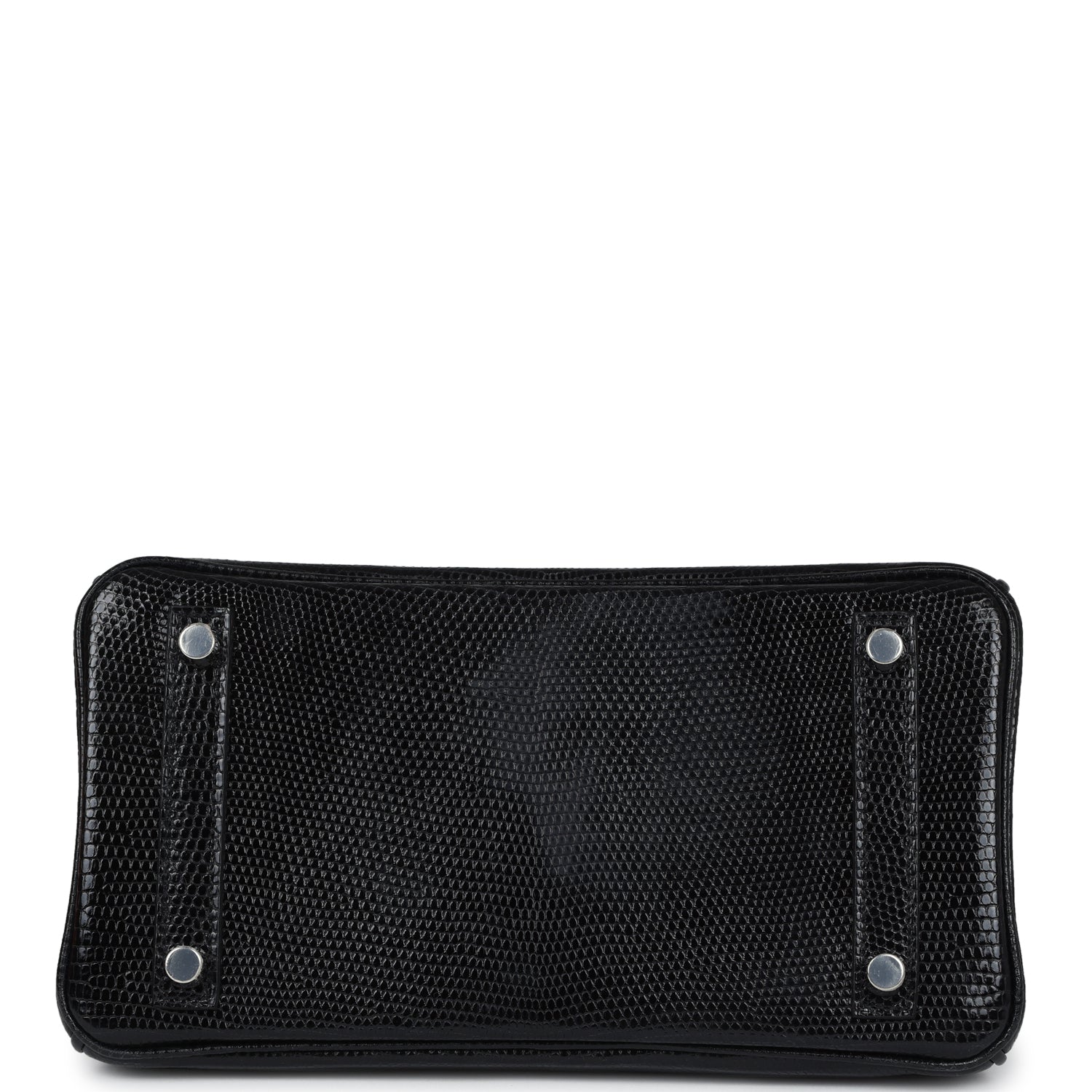 This Birkin is in Black shiny Varanus Niloticus lizard leather with palladium hardware and has tonal stitching, front flap, two straps with center toggle closure, clochette with lock and two keys, and double rolled handles.