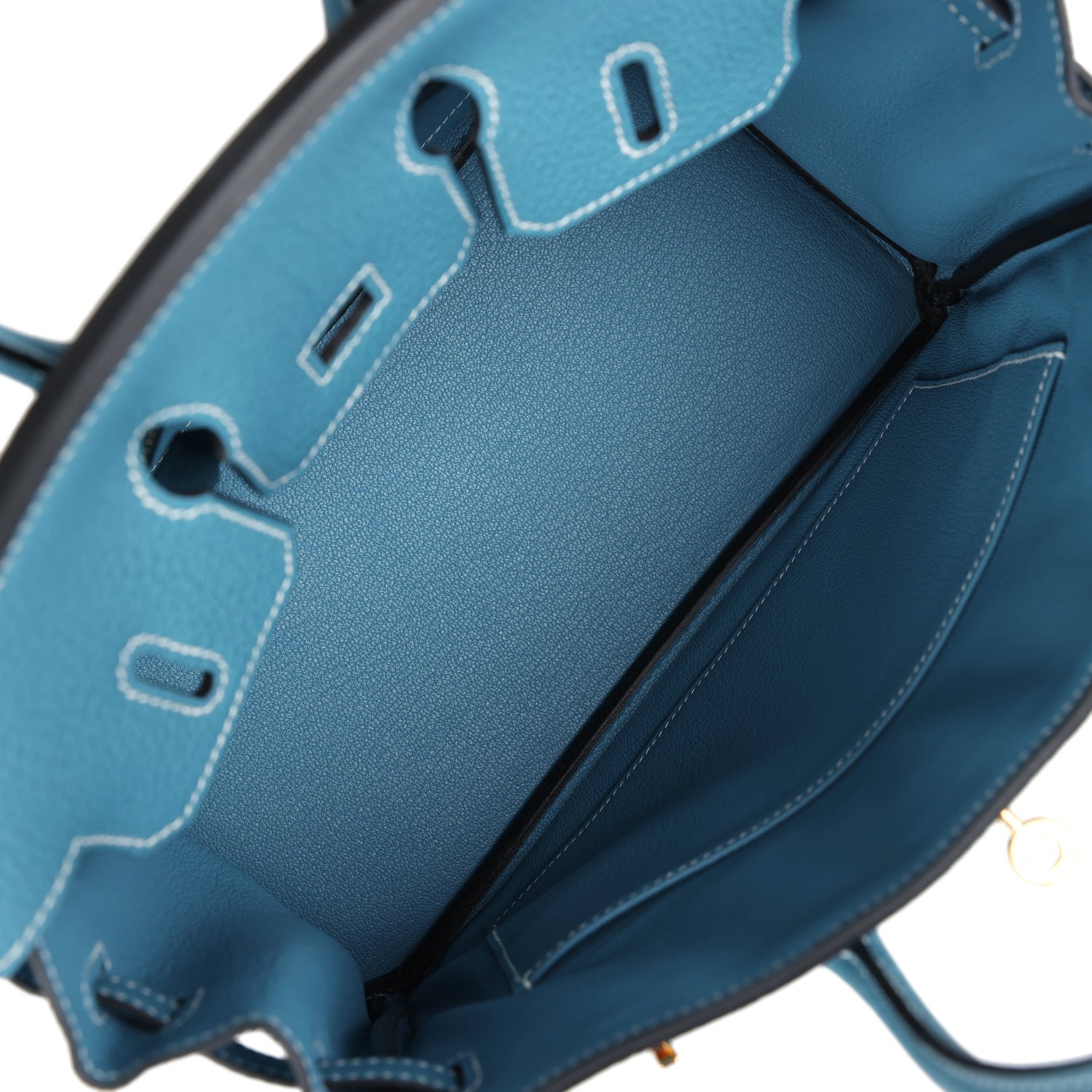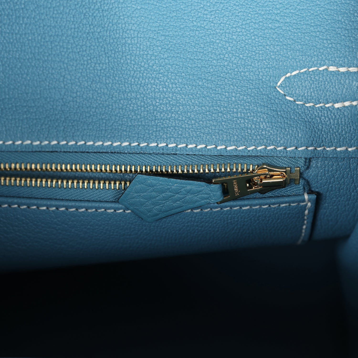 This Birkin is in Blue Jean togo leather with gold hardware and has contrast stitching, a front flap, two straps with center toggle closure, clochette with lock and two keys, and double rolled handles.