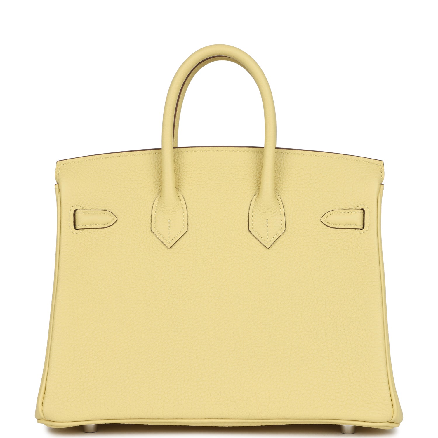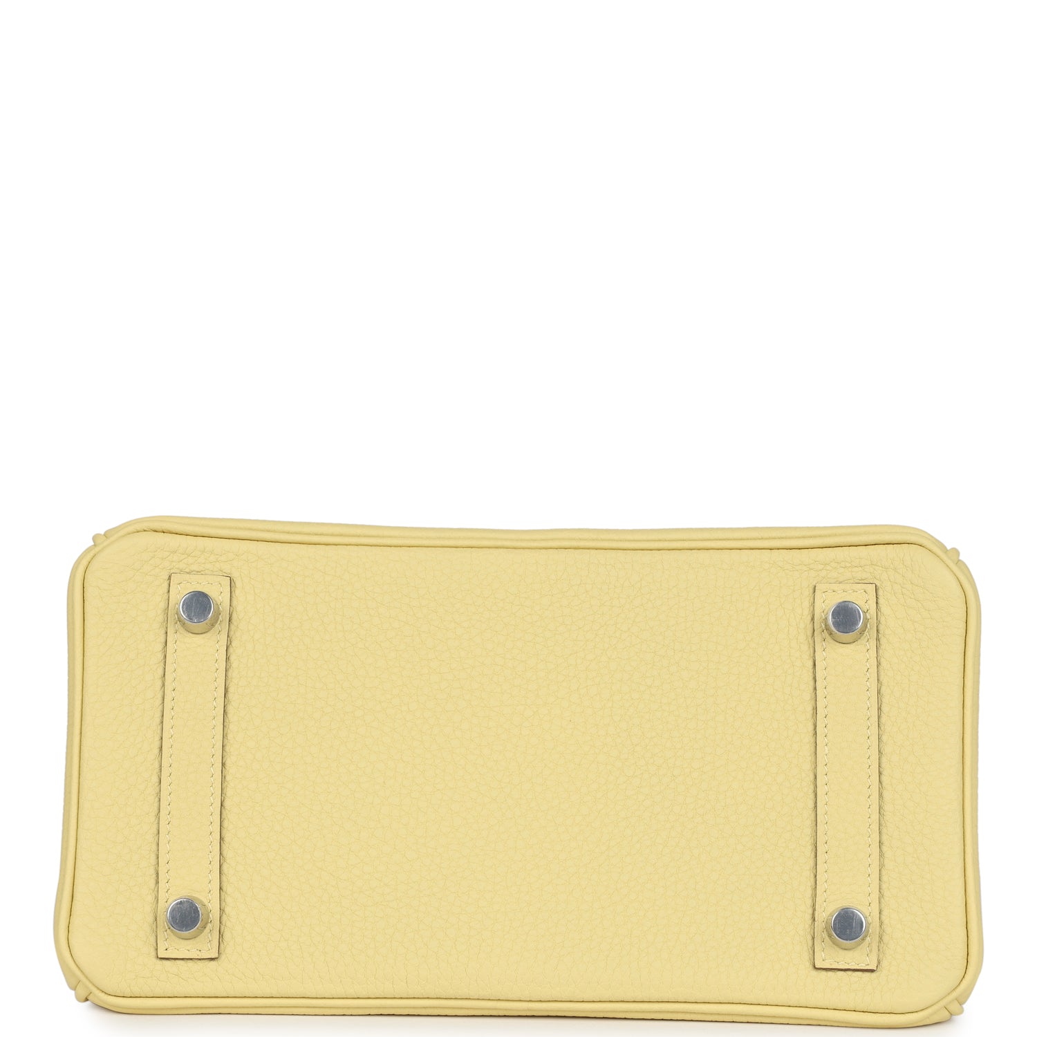 This Birkin is in Jaune Poussin togo leather with palladium hardware, has tonal stitching, front flap, two straps with center toggle closure, clochette with lock and two keys, and double rolled handles.