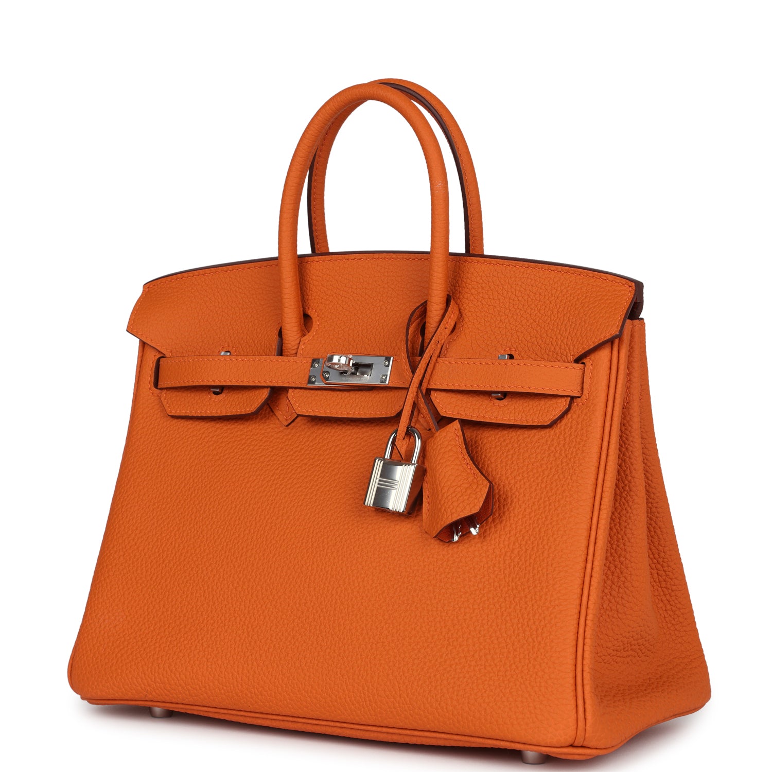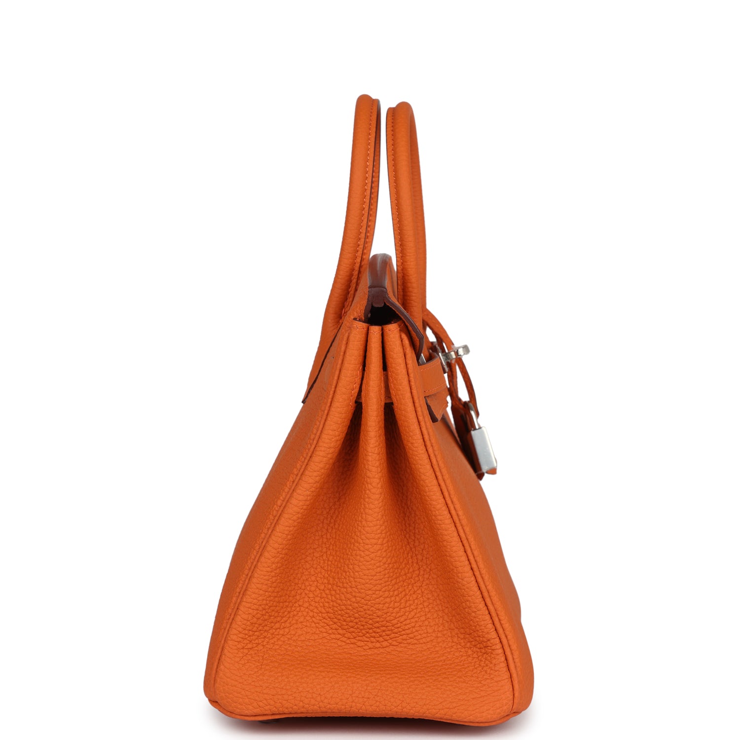 This Birkin is in Orange togo leather with palladium hardware and has tonal stitching, front flap, two straps with center toggle closure, clochette with lock and two keys, and double rolled handles.