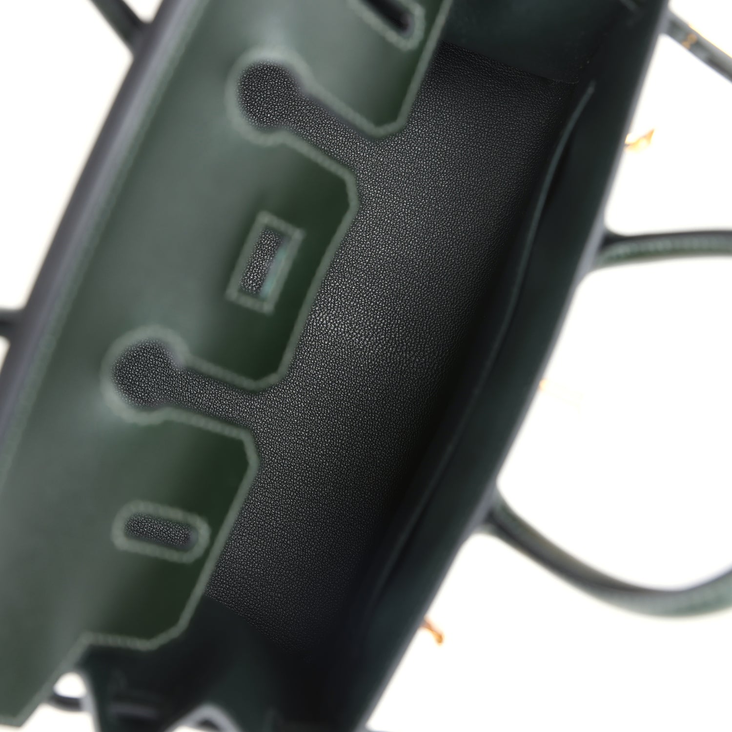 This Birkin is in Vert Fonce box calfskin leather with gold hardware and has tonal stitching, front flap, two straps with center toggle closure, clochette with lock and two keys, and double rolled handles.