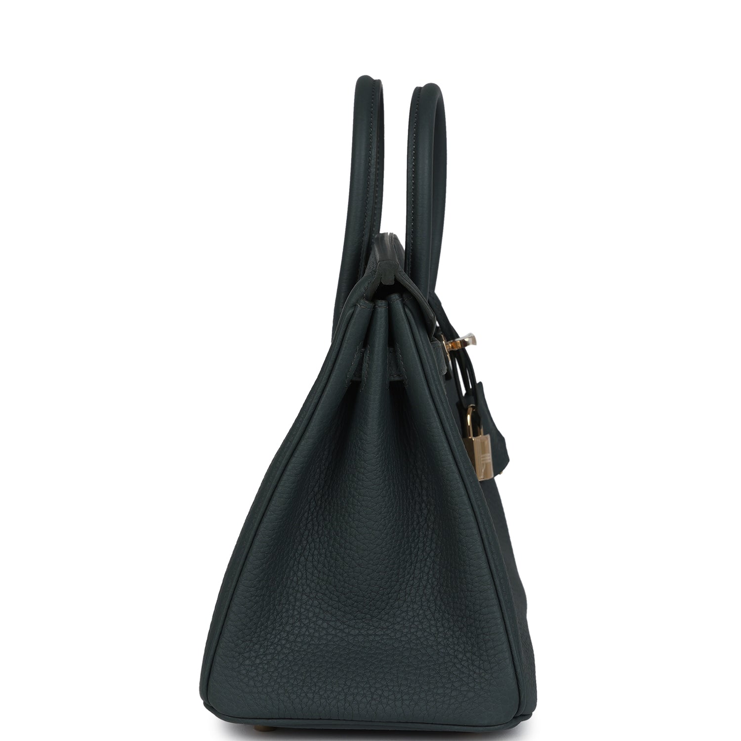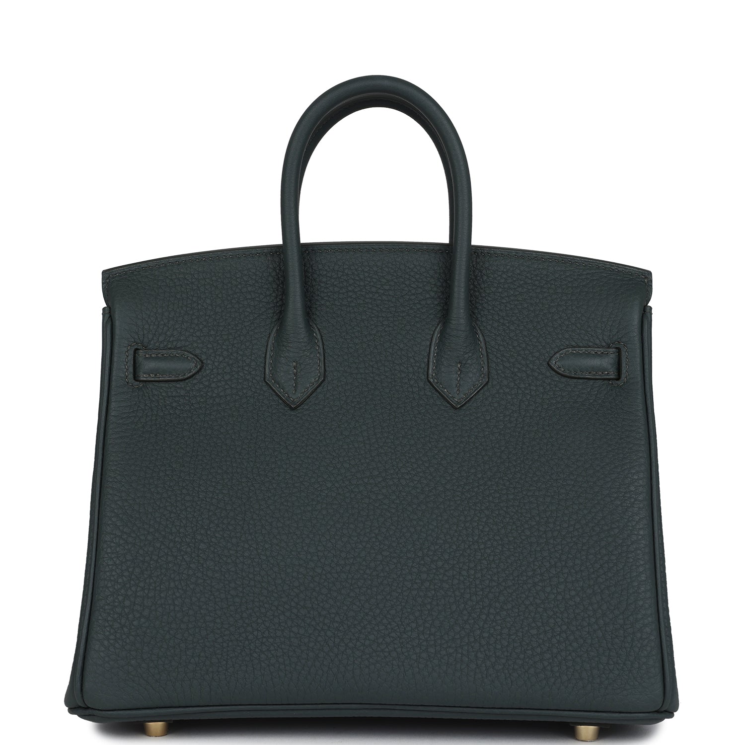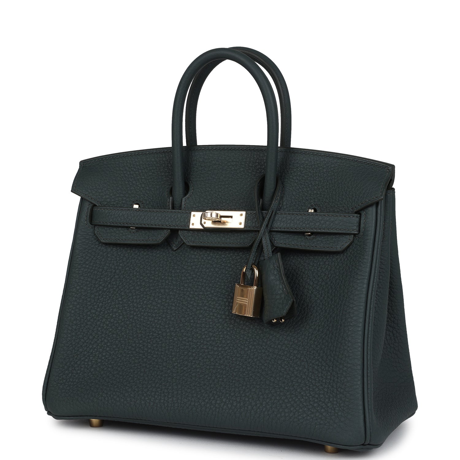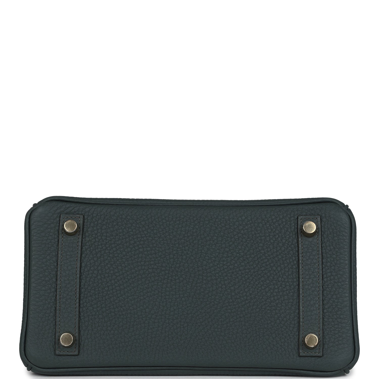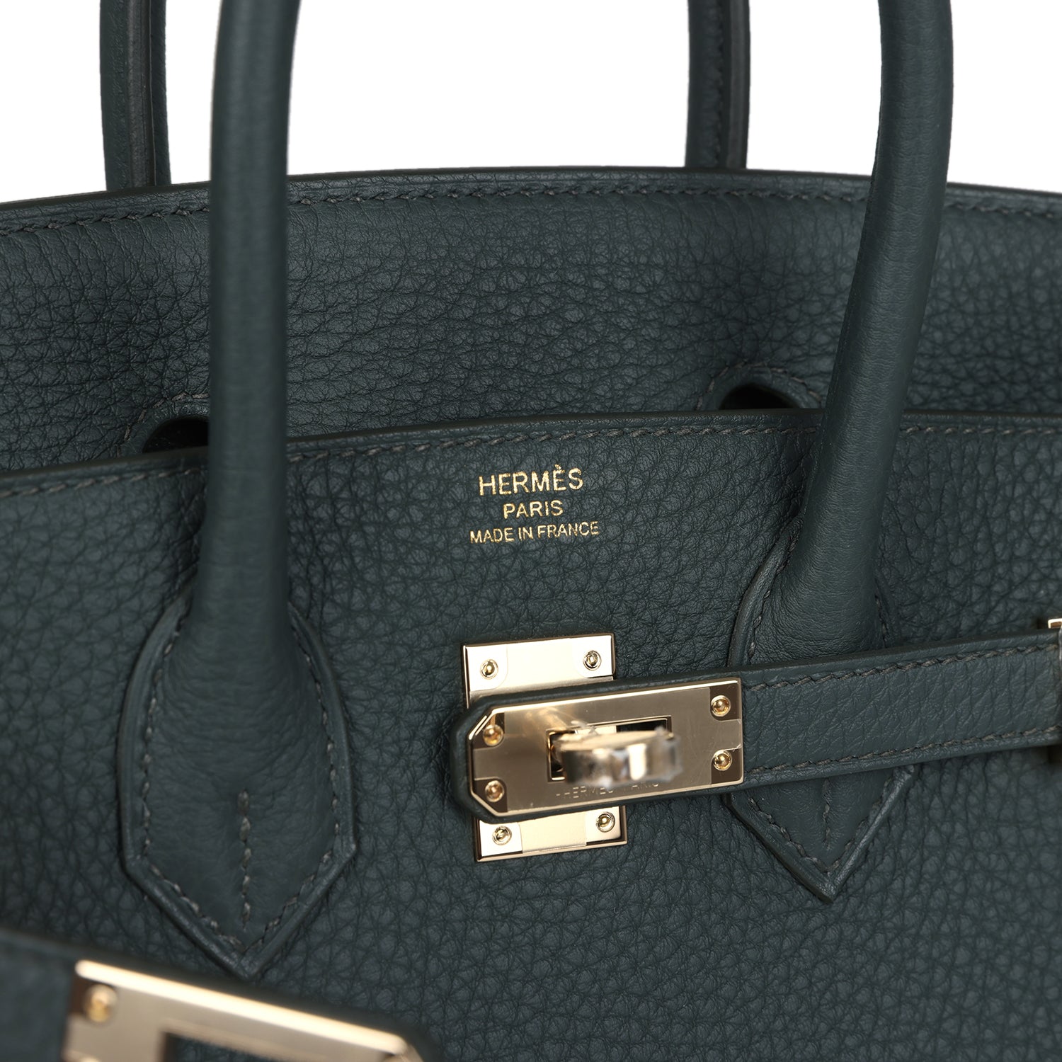 This Birkin is in Vert Mangrove togo leather with permabrass hardware, has tonal stitching, front flap, two straps with center toggle closure, clochette with lock and two keys, and double rolled handles.
