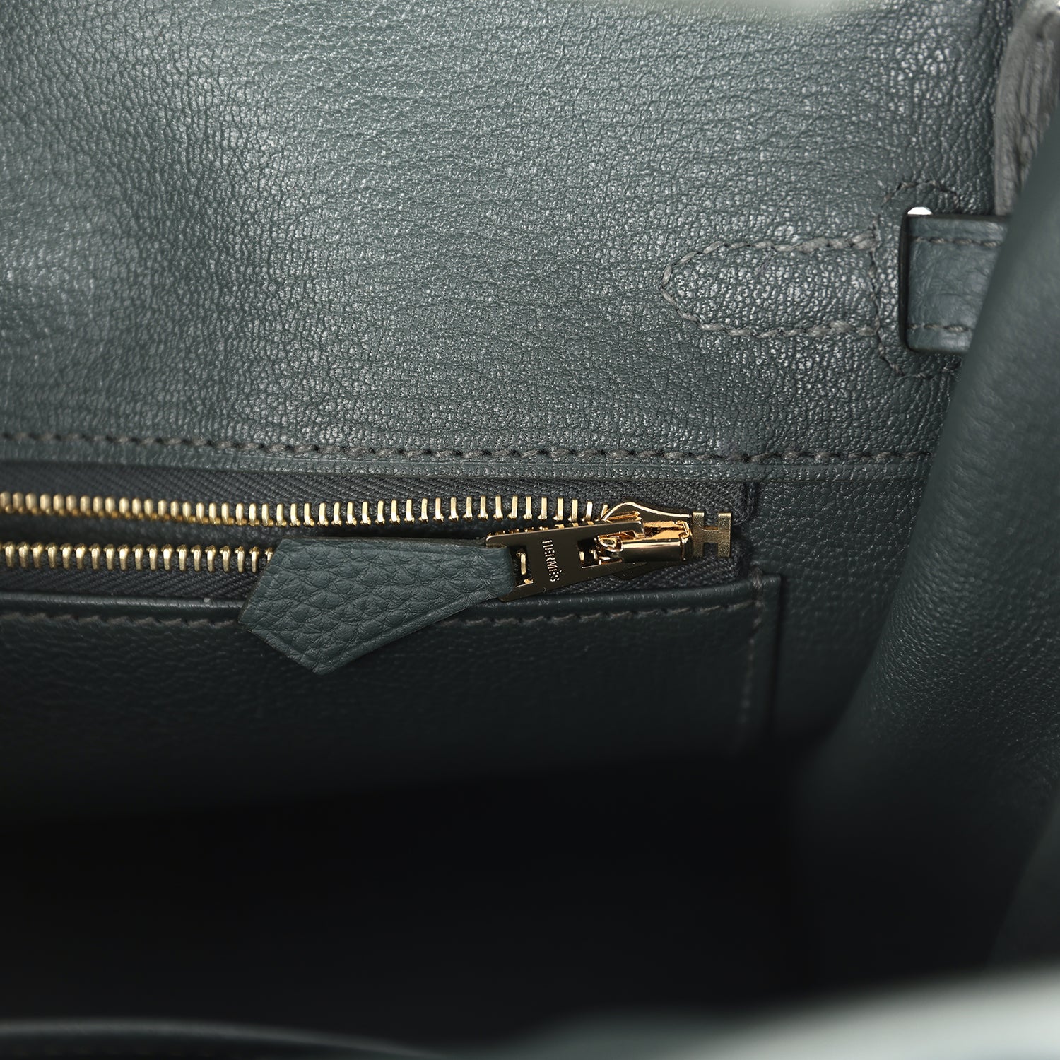 The interior is lined with Vert Mangrove chevre and has one zip pocket with an Hermès engraved zipper pull and an open pocket on the opposite side.