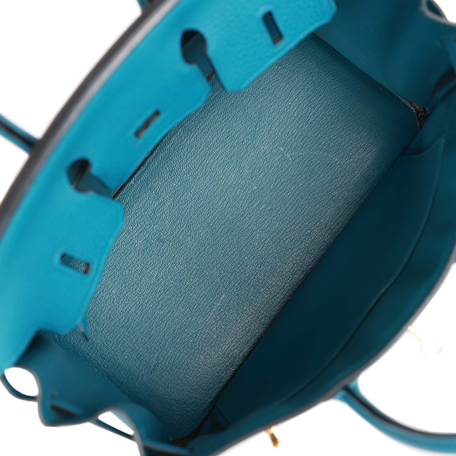 The interior is lined withCobalt chevre leather and has a zip pocket with an Hermes engraved zipper pull and an open pocket on the opposite side.