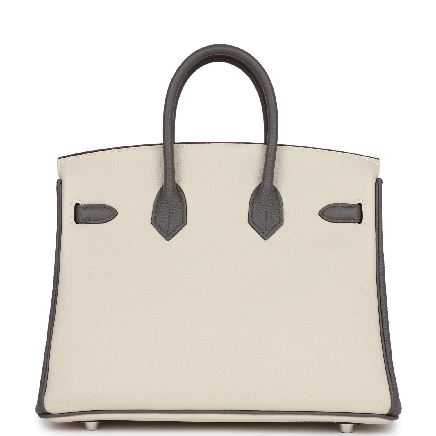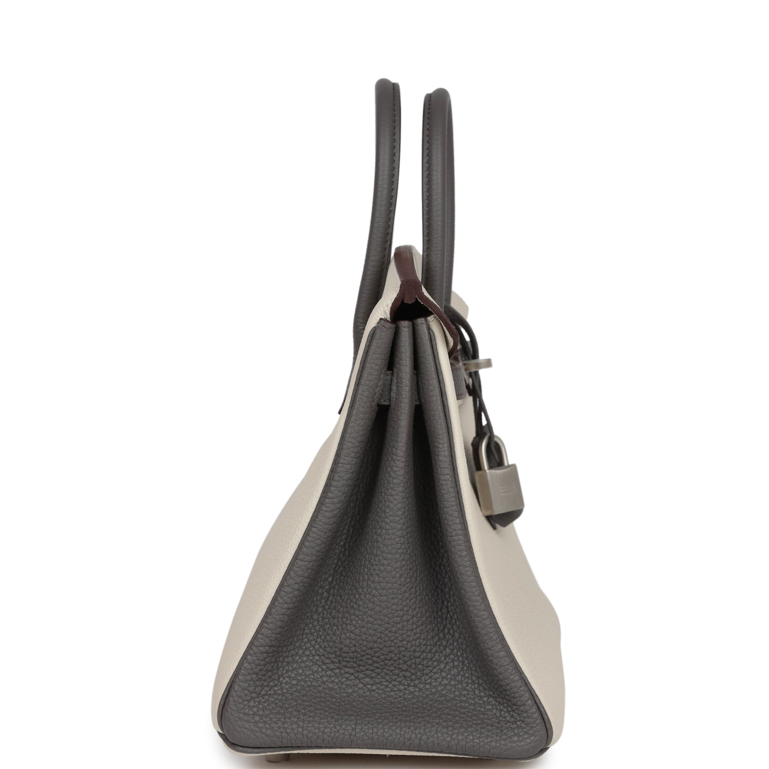 This Special Order Birkin is in Beton and Etain togo leather with brushed palladium hardware and has contrast stitching, front flap, two straps with center toggle closure, clochette with lock and two keys, and double rolled handles.