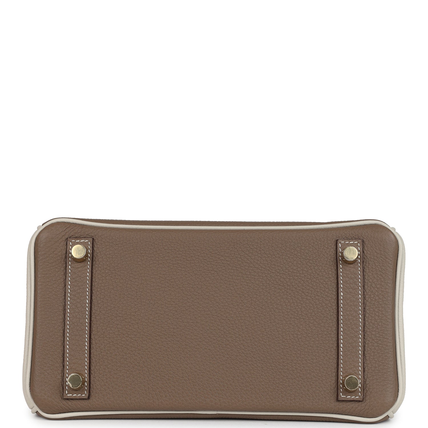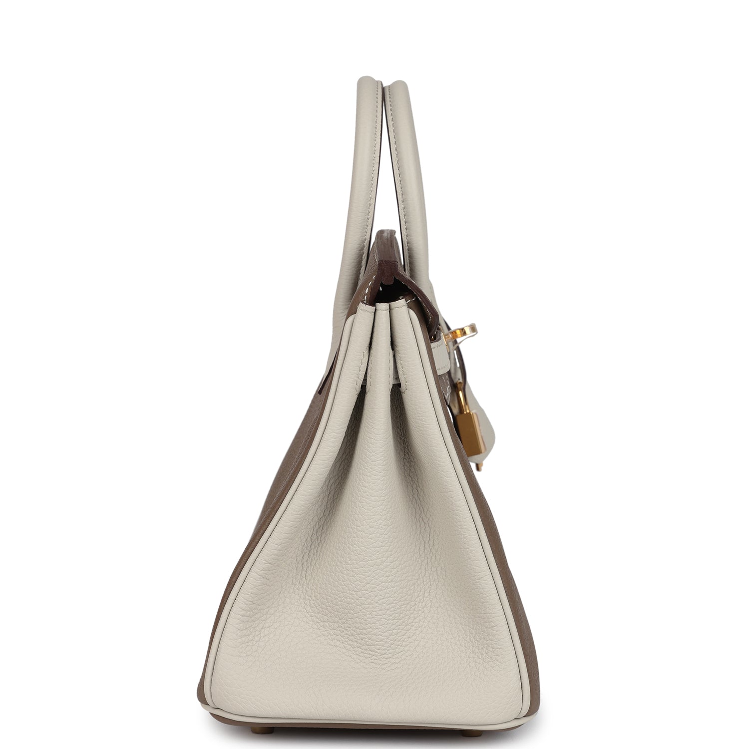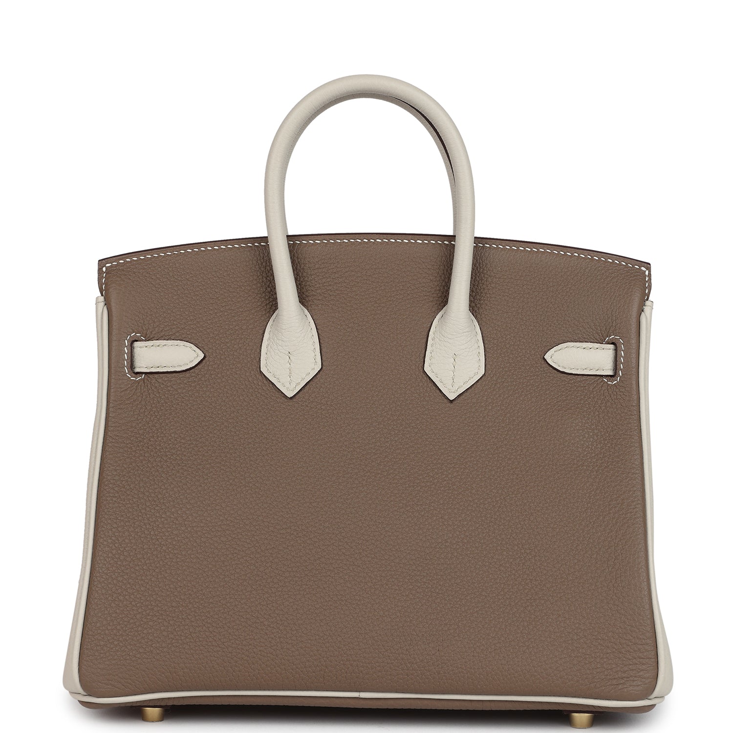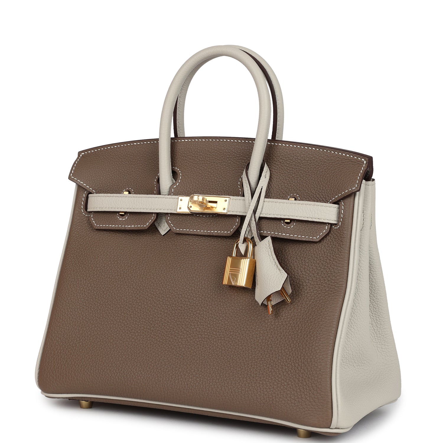 Special Order Bi-color Birkin is in Etoupe and Craie togo leather with gold hardware, has contrast and tonal stitching, front flap, two straps with center toggle closure, clochette with lock and two keys, and double rolled handles.