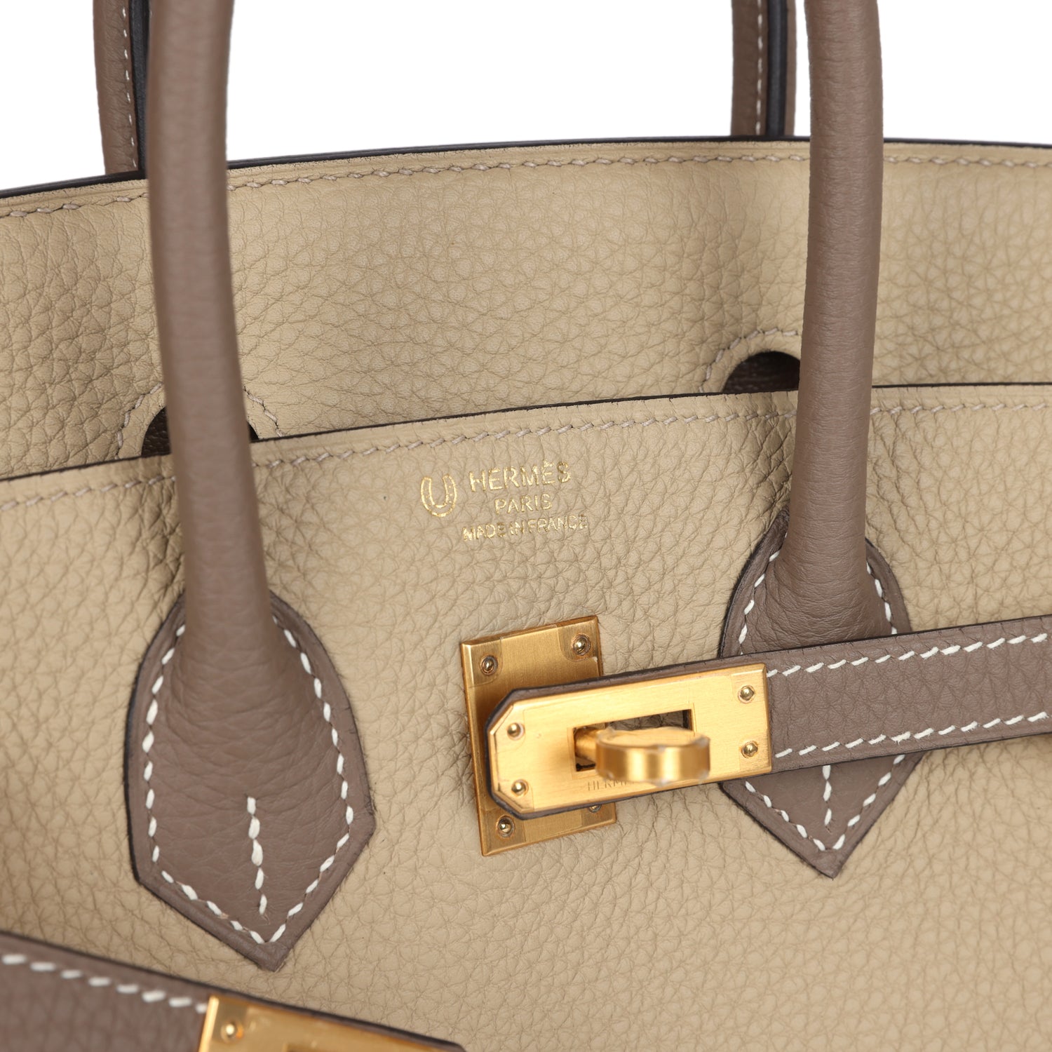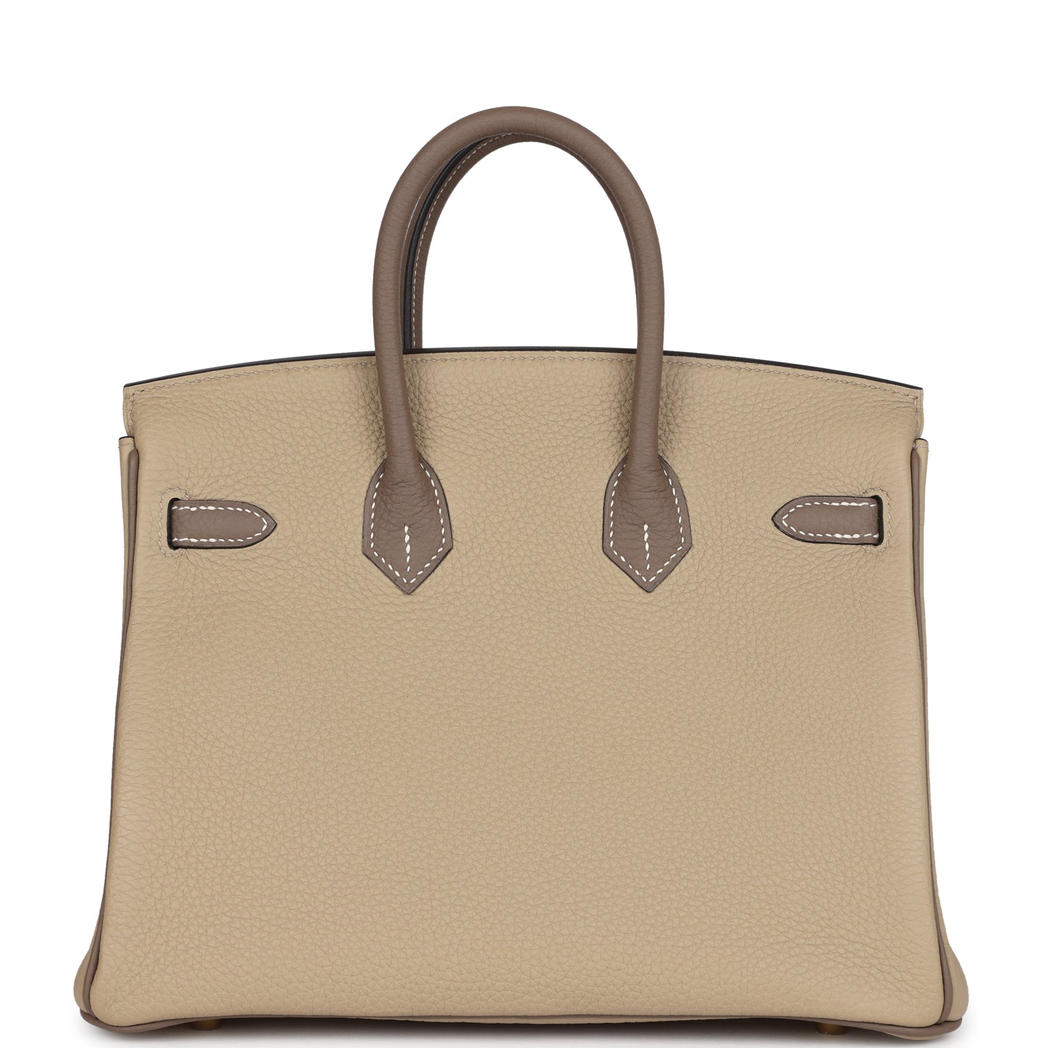 This Special Order Birkin is of Etoupe and Trench togo leather with brushed gold hardware, contrast stitching, front flap with two straps, front toggle closure, clochette with lock and two keys, double rolled handles.