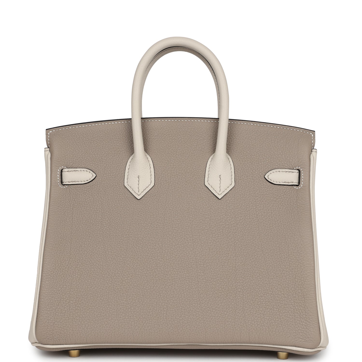 This Special Order Birkin is in Gris Tourterelle and Craie togo leather with brushed gold hardware and has contrast stitching, front flap, two straps with center toggle closure, clochette with lock and two keys, and double rolled handles.