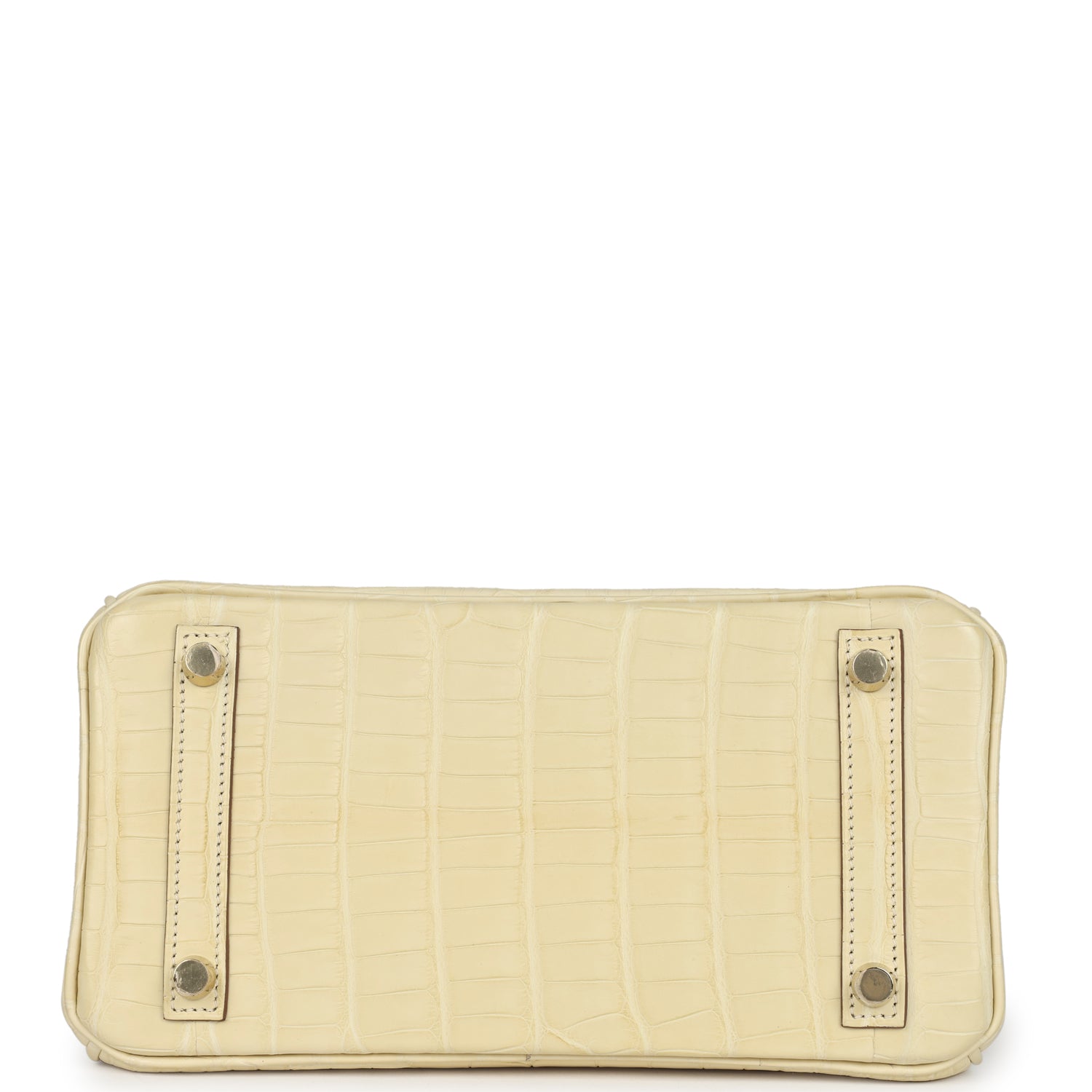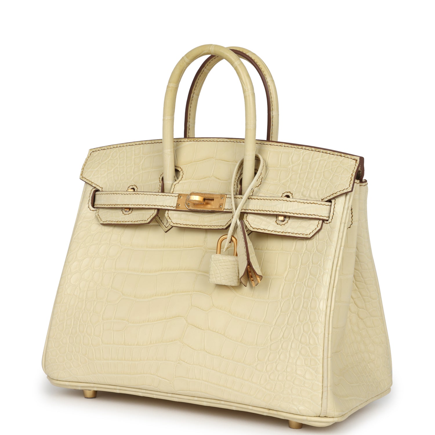 This Special Order Birkin in Vanille Matte Alligator Mississippiensis leather with brushed gold hardware, has contrast stitching, front flap, two straps with center toggle closure, clochette with lock and two keys, and double rolled handles.