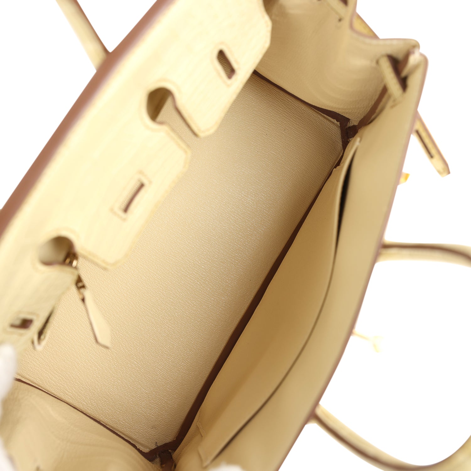 The interior is lined with Vanille Chevre and has one zip pocket with an Hermes engraved zipper pull and an open pocket on the opposite side.