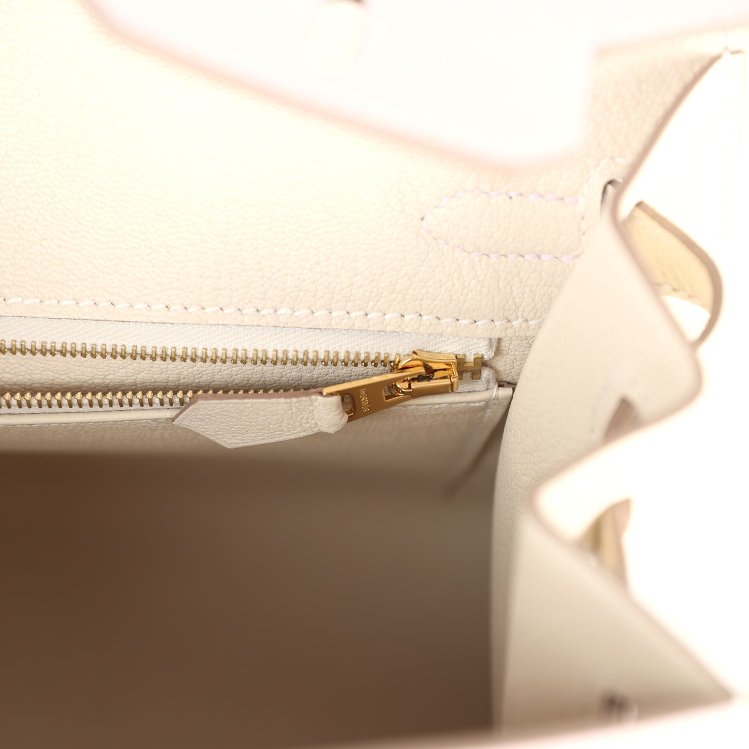 The interior is lined with Craie chevre and has one zip pocket with an Hermes engraved zipper pull and an open pocket on the opposite side.