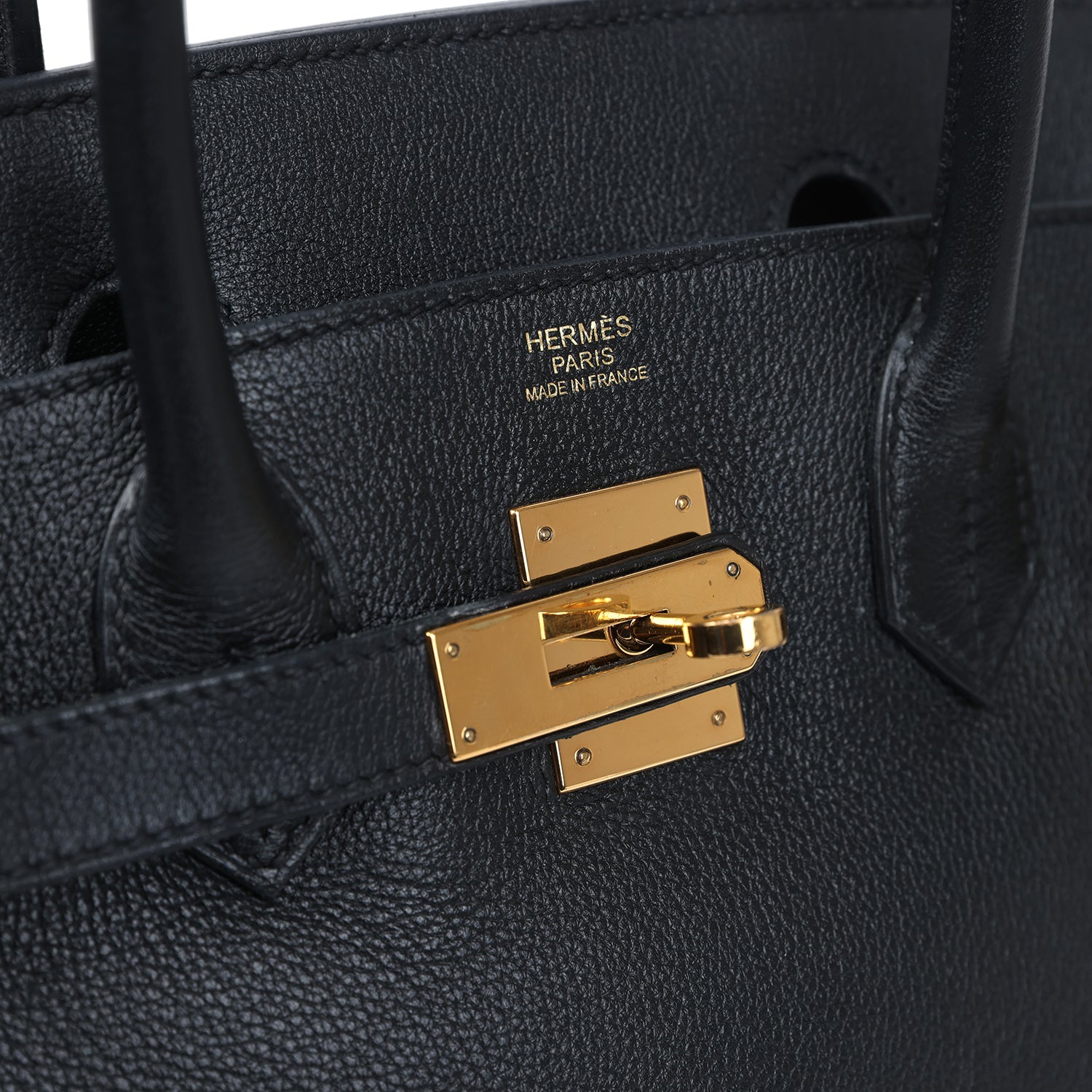 This Birkin is in Black novillo leather with gold hardware and has tonal stitching, front flap, two straps with center toggle closure, clochette with lock and two keys, and double rolled handles.