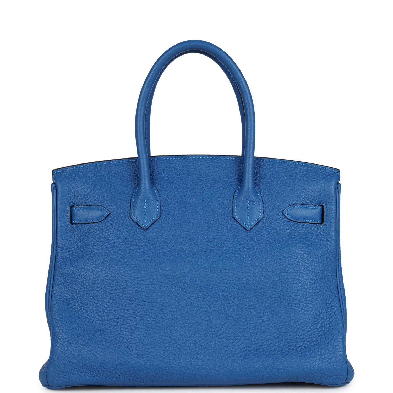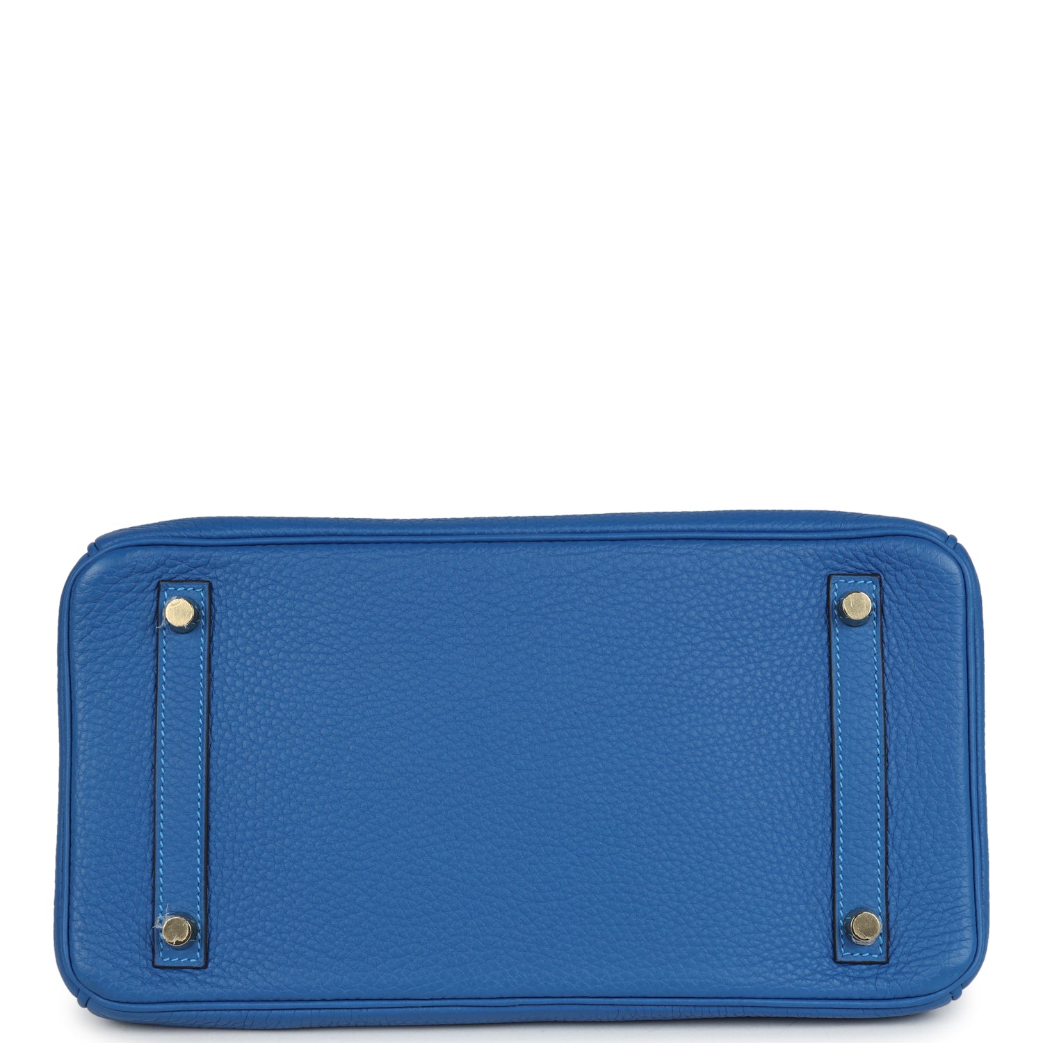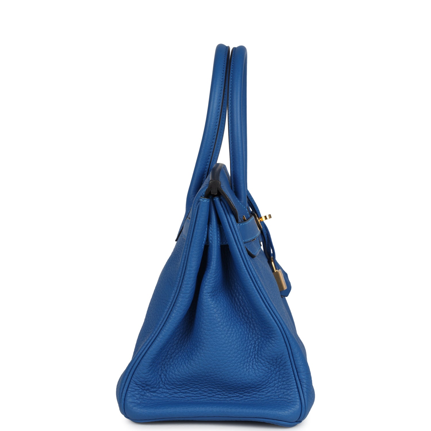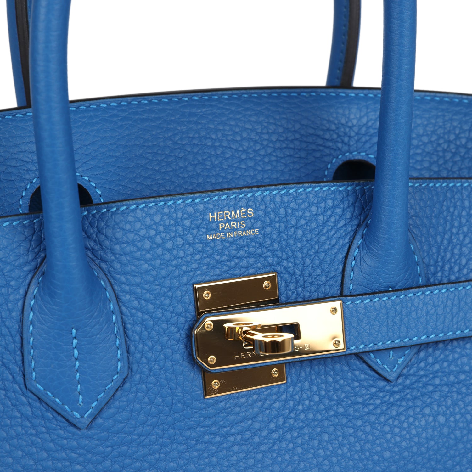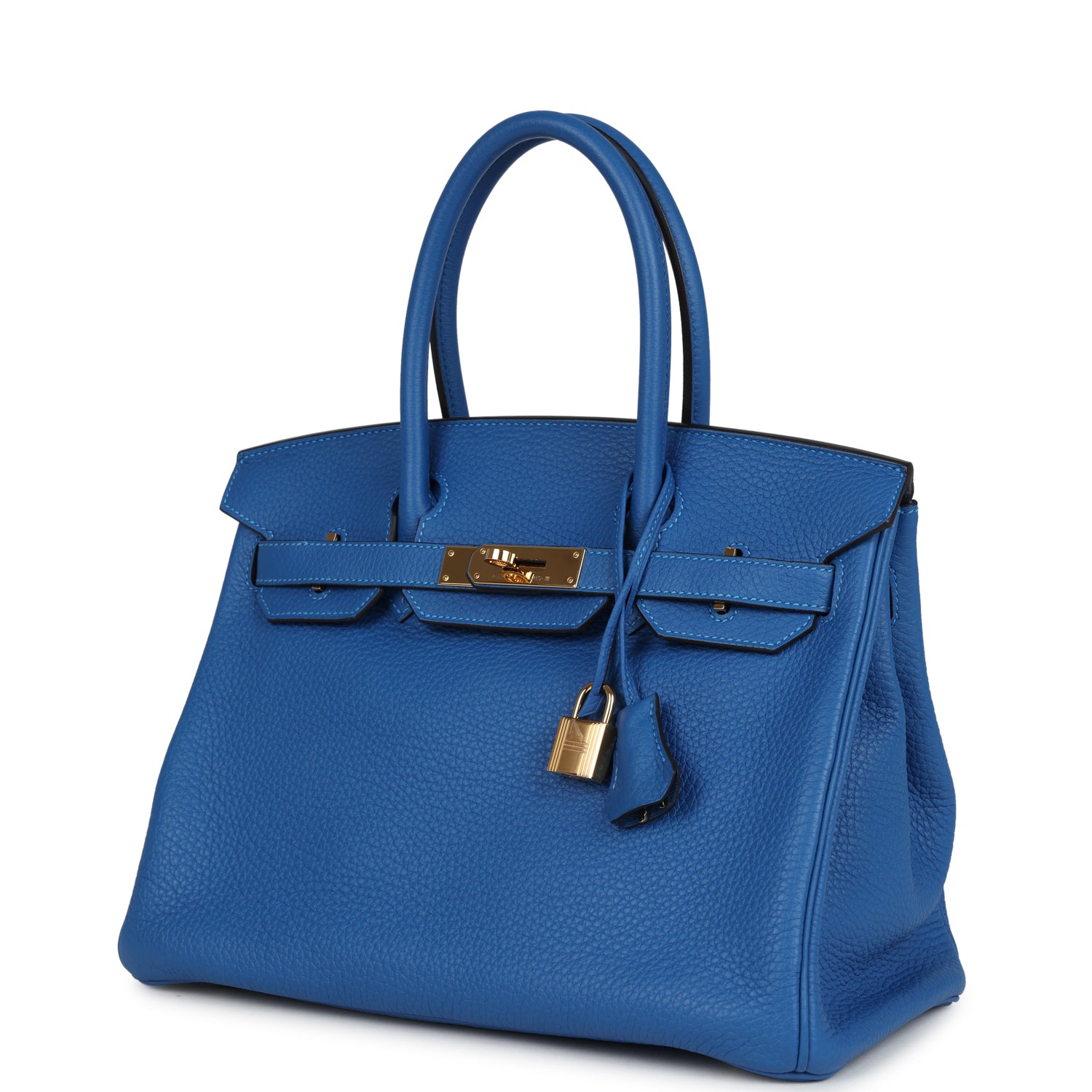 This Birkin is in Bleu Hydra clemence leather with gold hardware, and has tonal stitching, front flap with two straps, front toggle closure, clochette with lock and two keys, and double rolled handles.