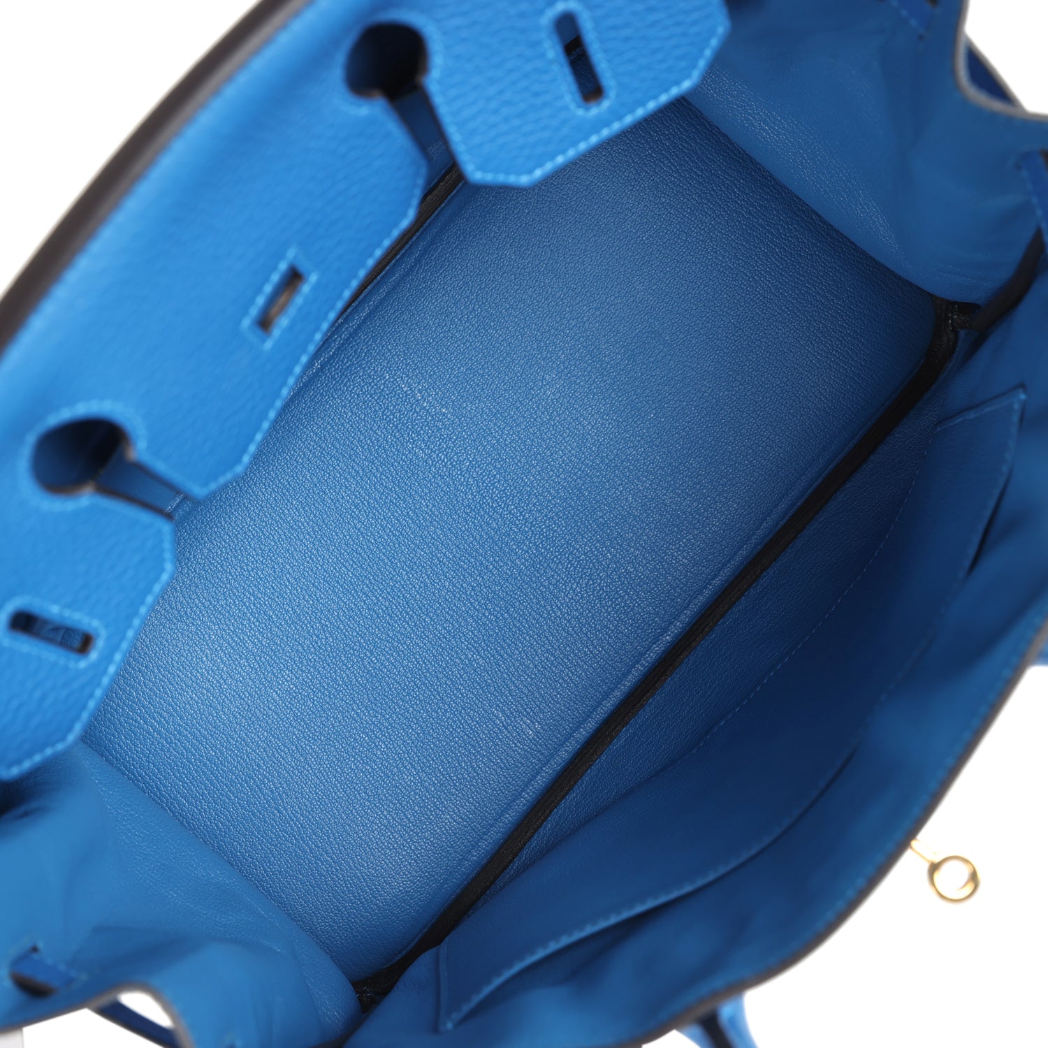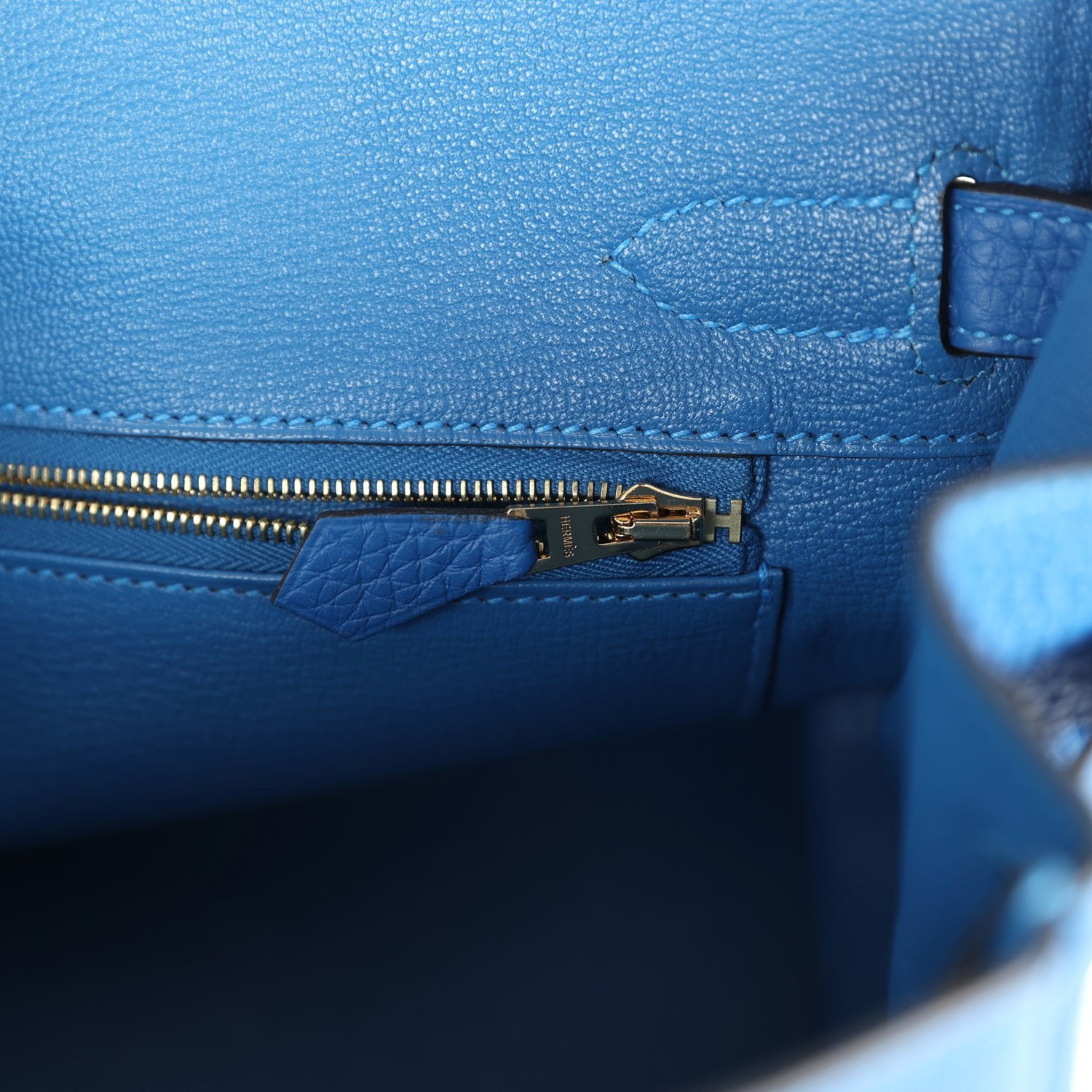 The interior is lined in Bleu Hydra chevre leather and has one zip pocket with Hermes engraved pull; pocket on opposite side.