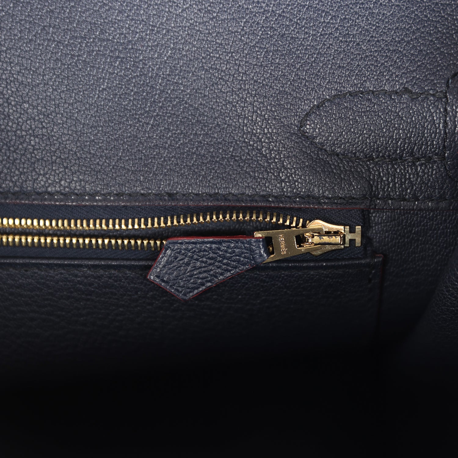 The interior is lined in Bleu Indigo chevre leather and has a zip pocket with Hermes engraved pull; pocket on opposite side.