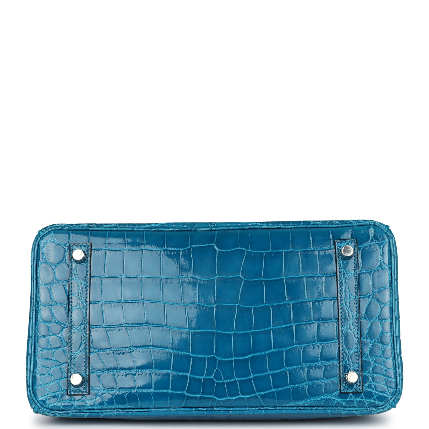 This Birkin is in Bleu Izmir shiny Niloticus crocodile with palladium hardware and has tonal stitching, front flap, two straps with center toggle closure, clochette with lock and two keys, and double rolled handles.