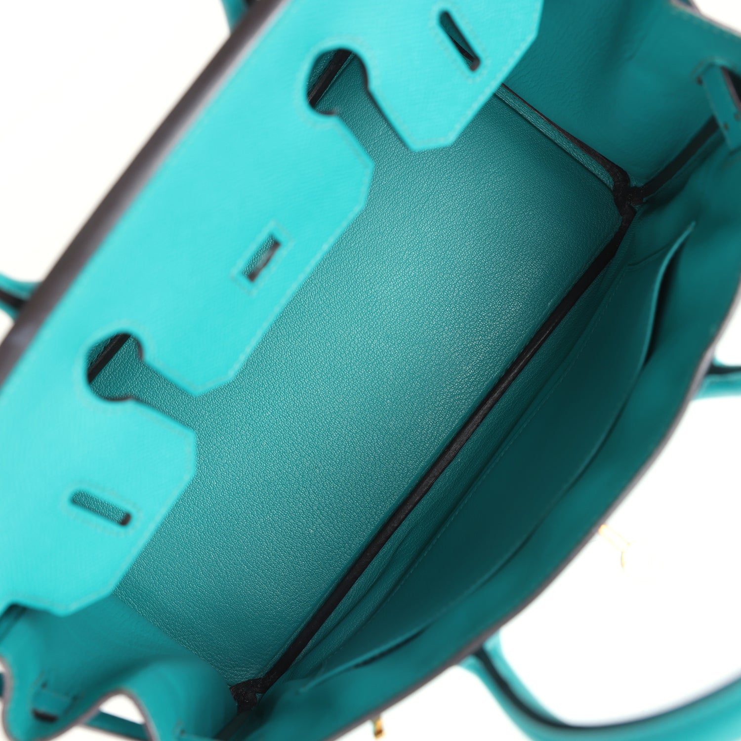 The interior is lined with Bleu Paon chevre and has one zip pocket with an Hermes engraved zipper pull and an open pocket on the opposite side.