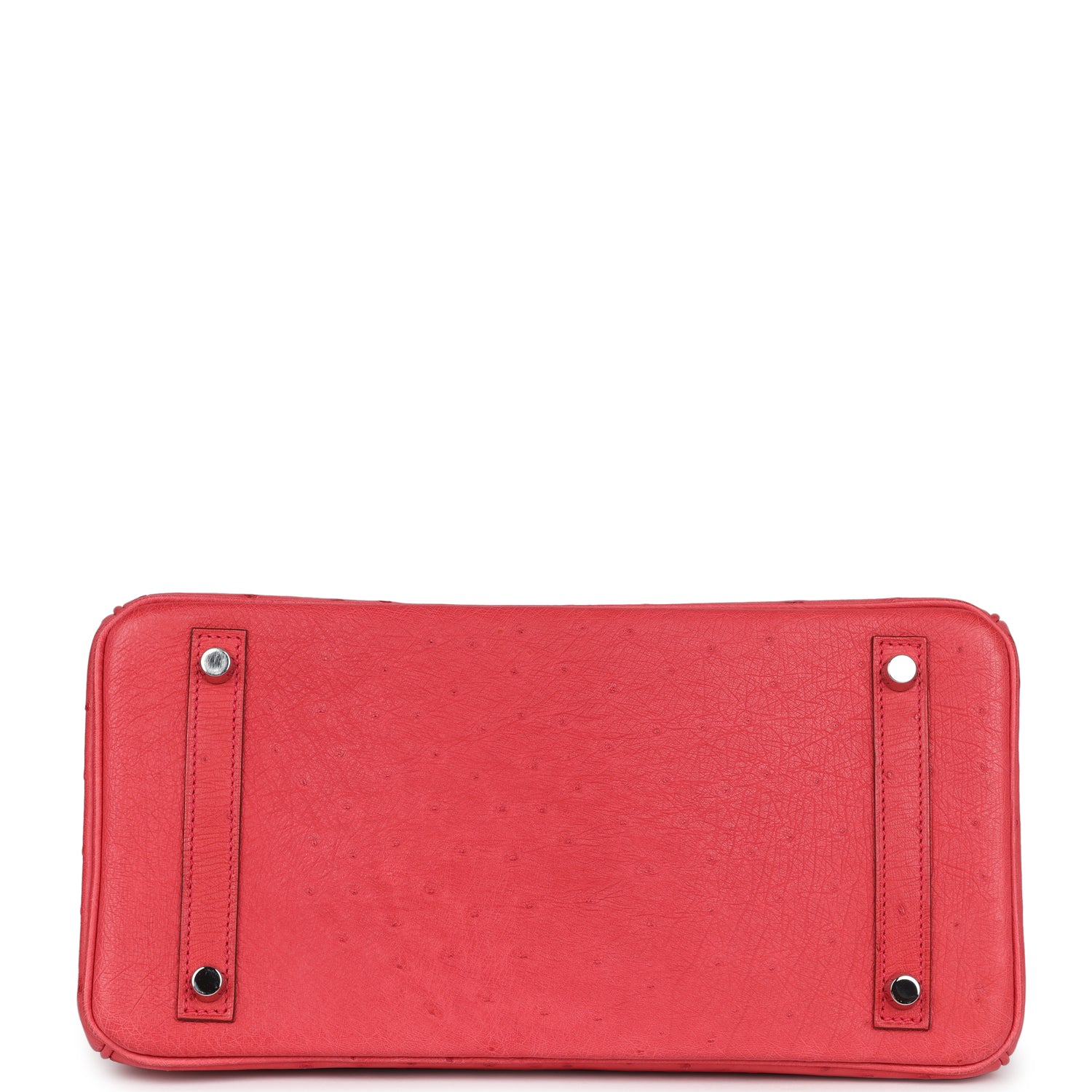 This Birkin is in Bougainvillea ostrich leather with palladium hardware and features tonal stitching, front flap, two straps with center toggle closure, clochette with lock and two keys, and double rolled handles.