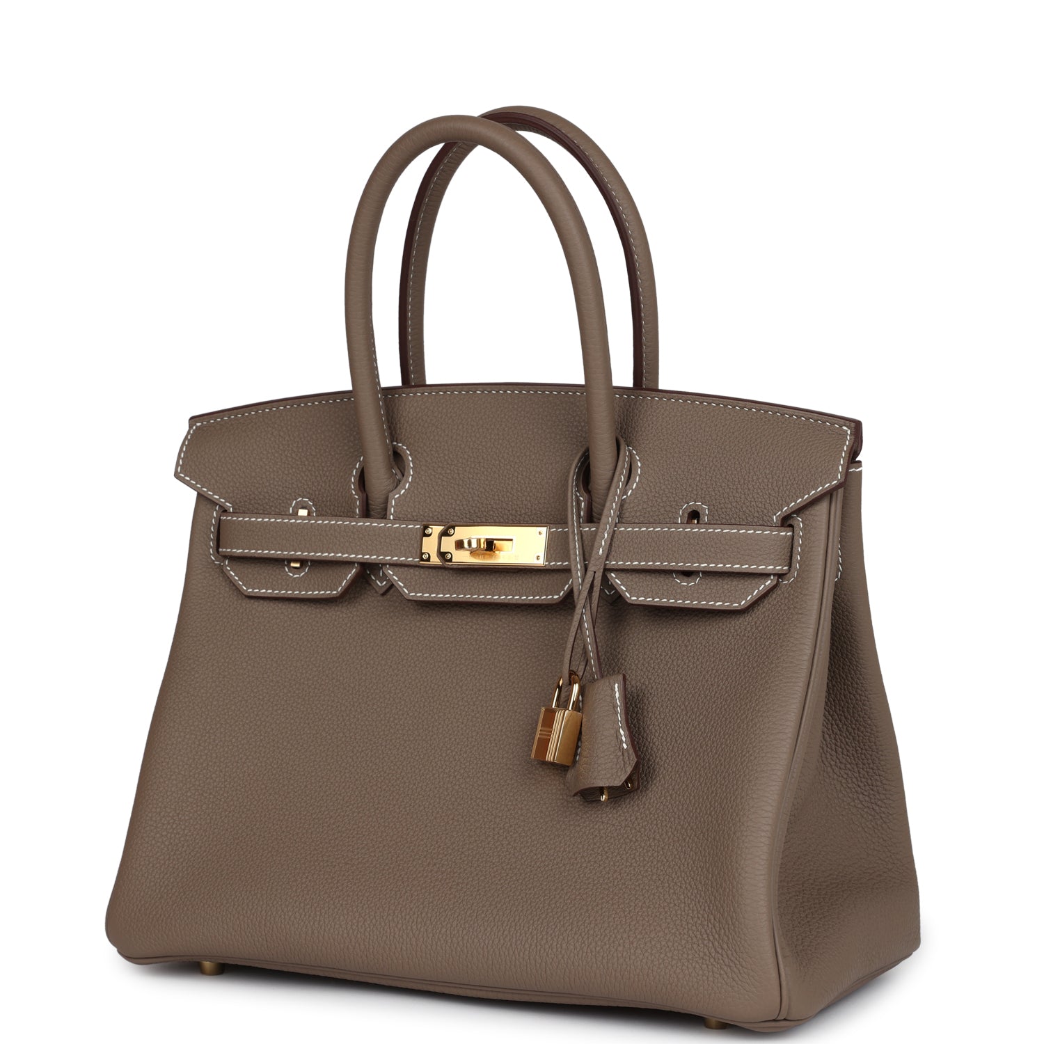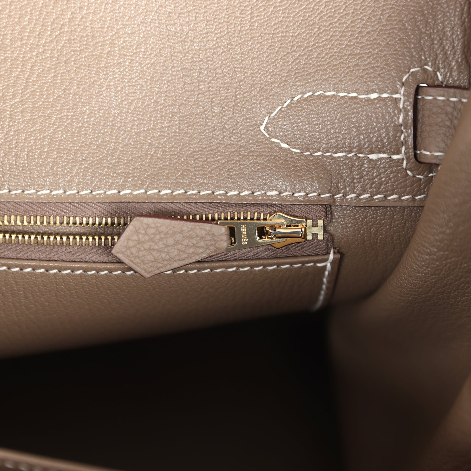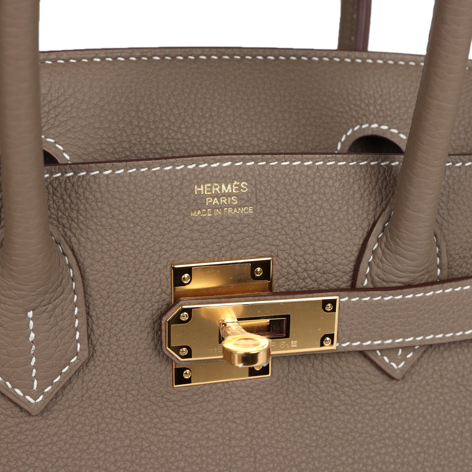 This Birkin is in Etoupe togo leather with gold hardware and has contrast stitching, front flap, two straps with center toggle closure, clochette with lock and two keys and double rolled handles.