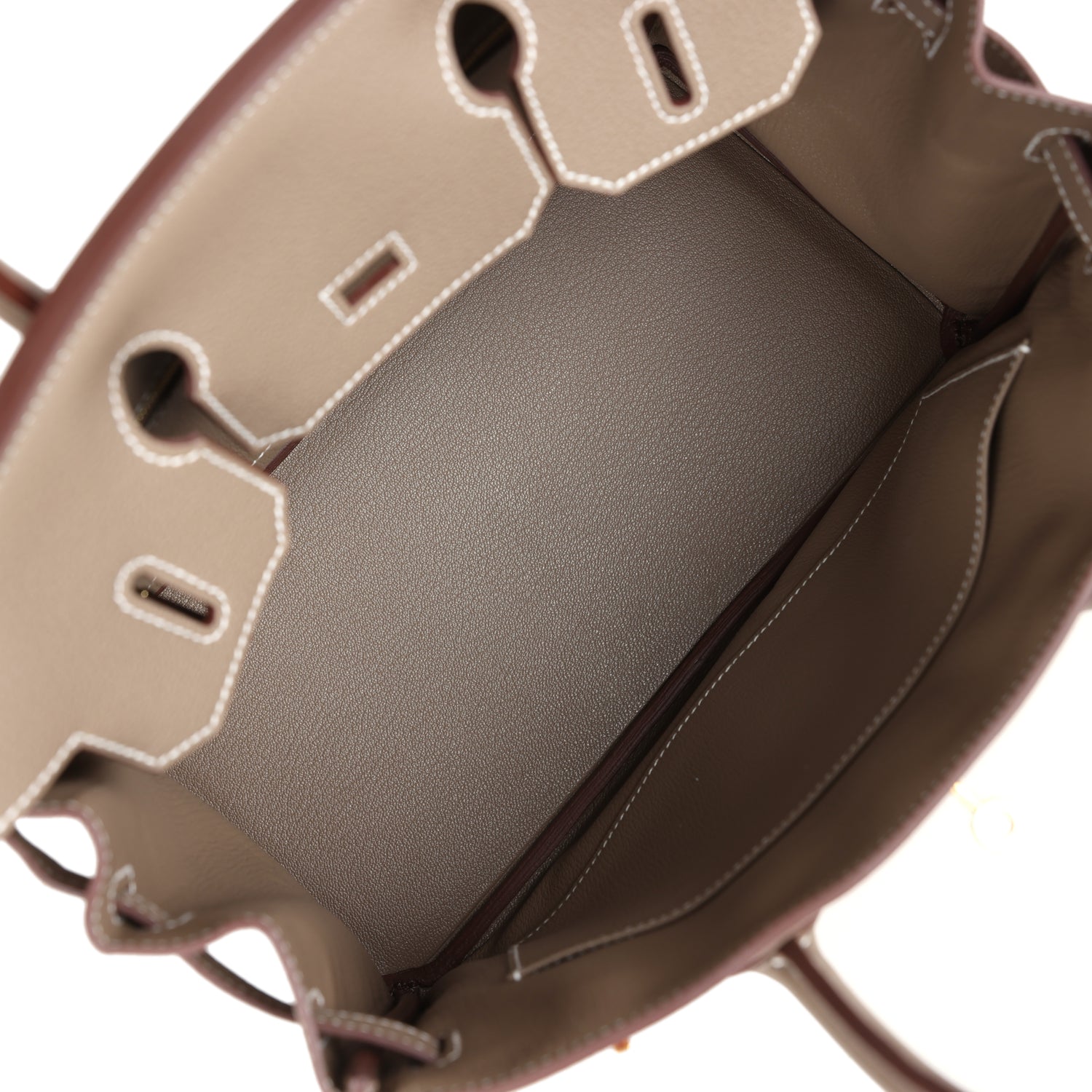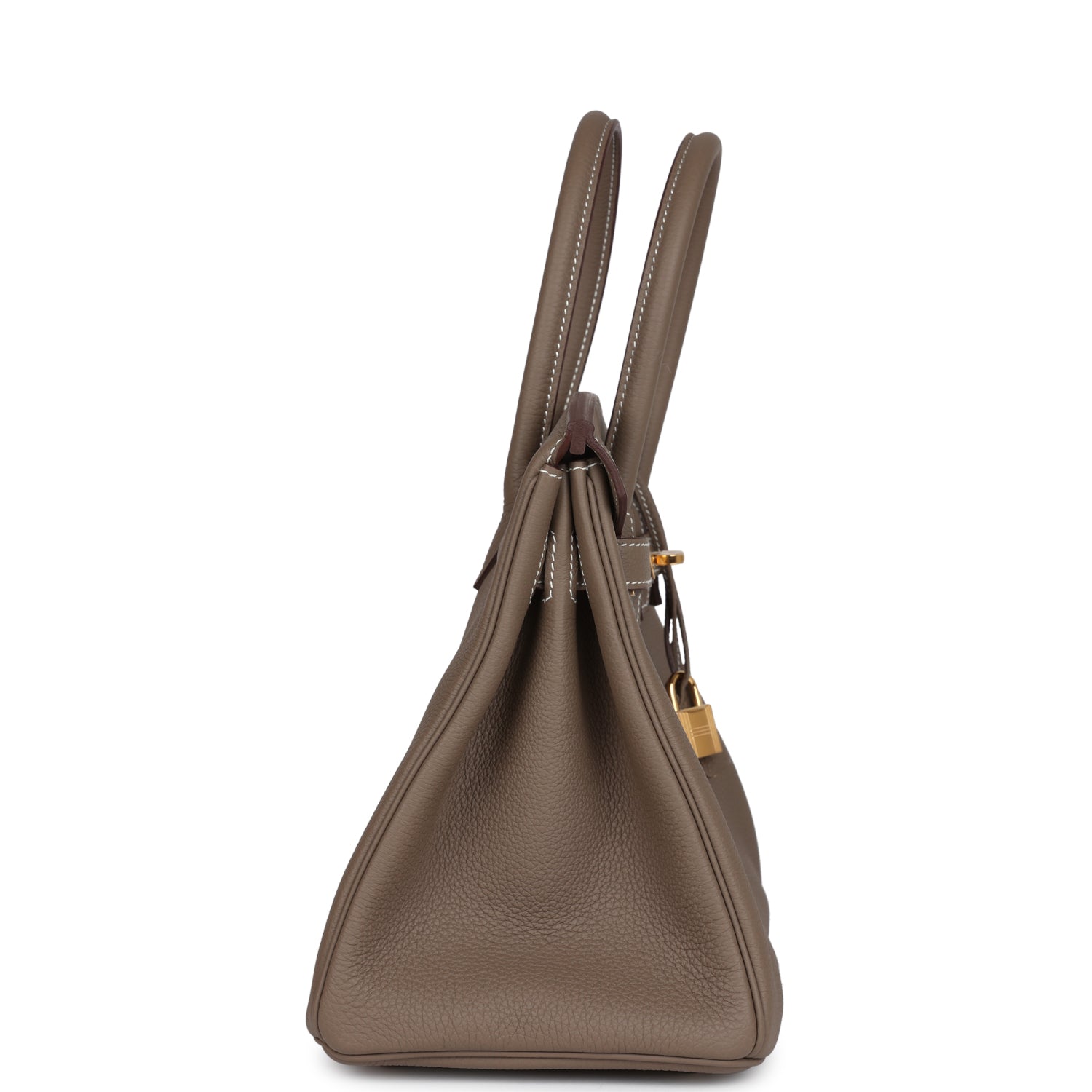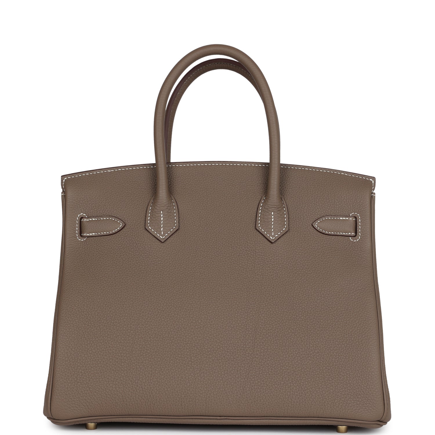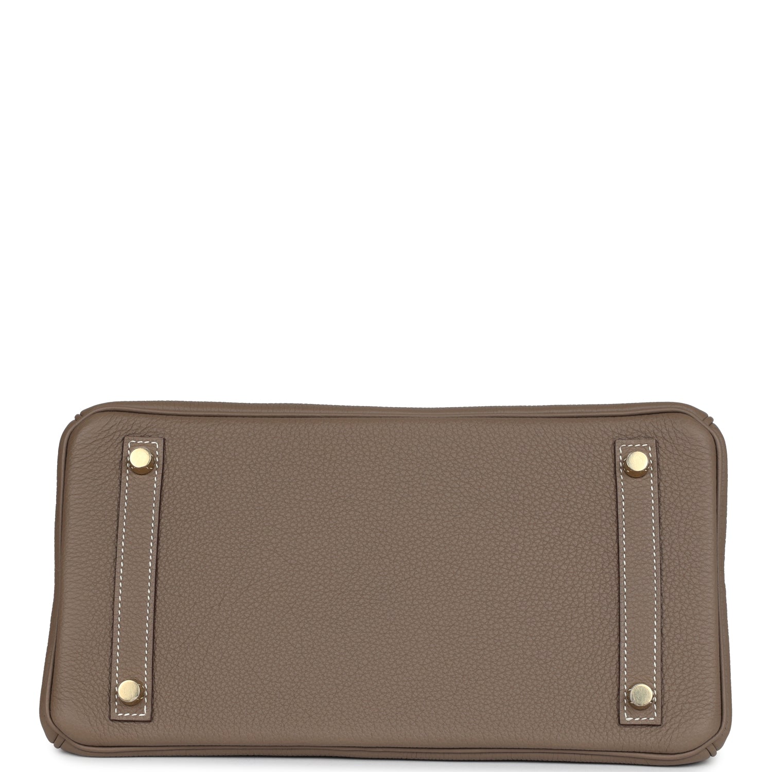 This Birkin is in Etoupe togo leather with gold hardware and has contrast stitching, front flap, two straps with center toggle closure, clochette with lock and two keys and double rolled handles.