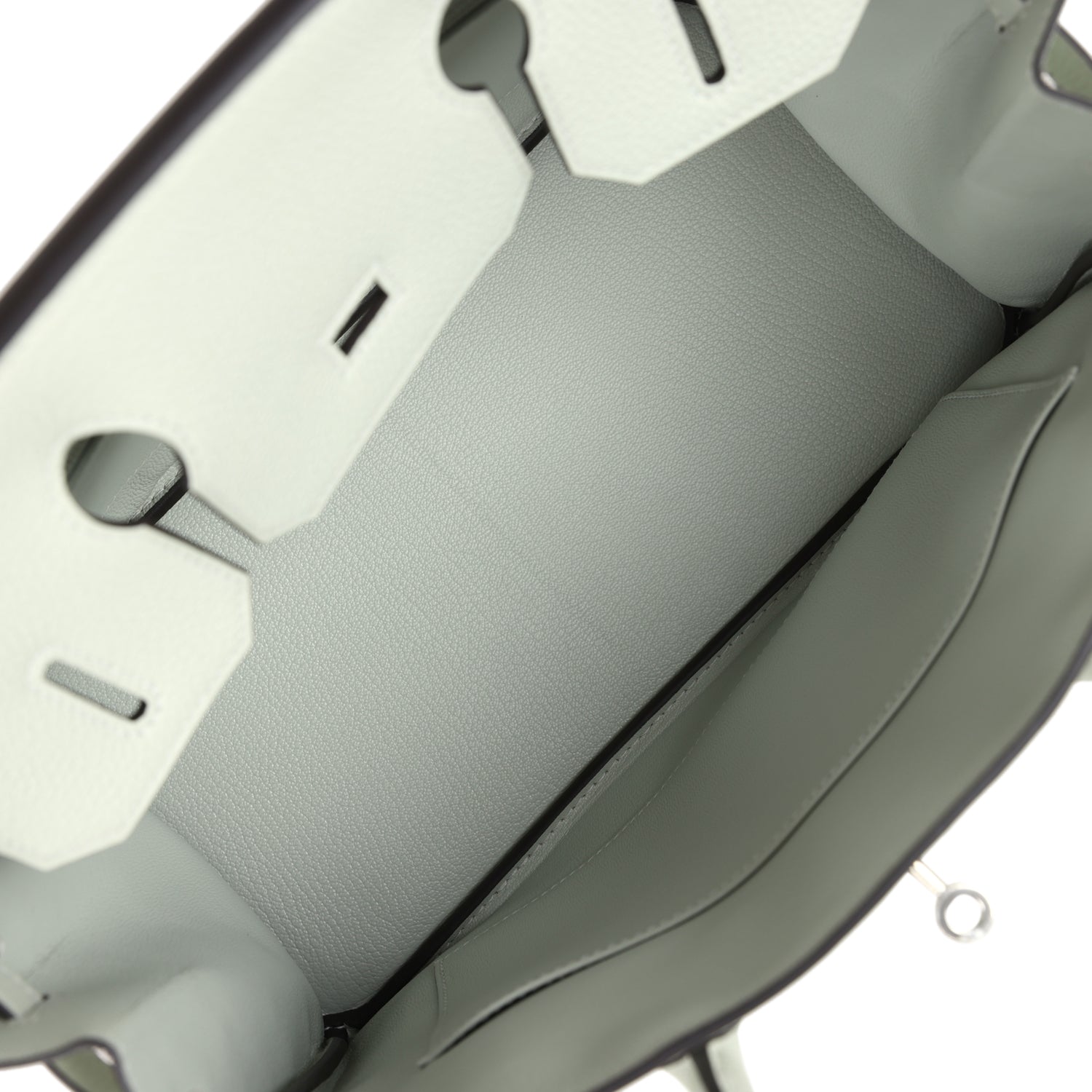 The interior is lined with Gris Neve chevre leather and has a zip pocket with an Hermes engraved zipper pull and an open pocket on the opposite side.