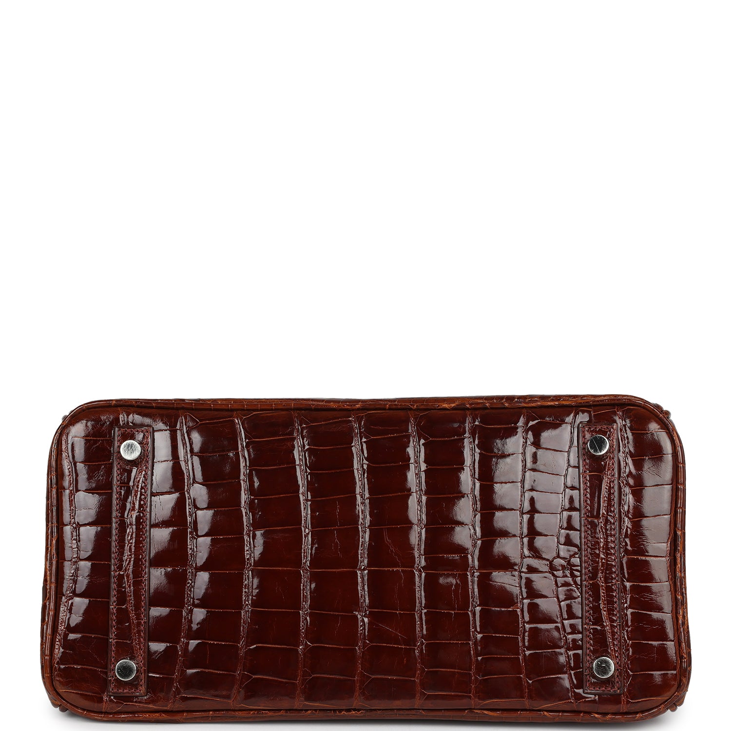 This Birkin is in Miel shiny Niloticus crocodile with palladium hardware and has tonal stitching, two straps with front toggle closure, clochette with lock and two keys and double rolled crocodile handles.