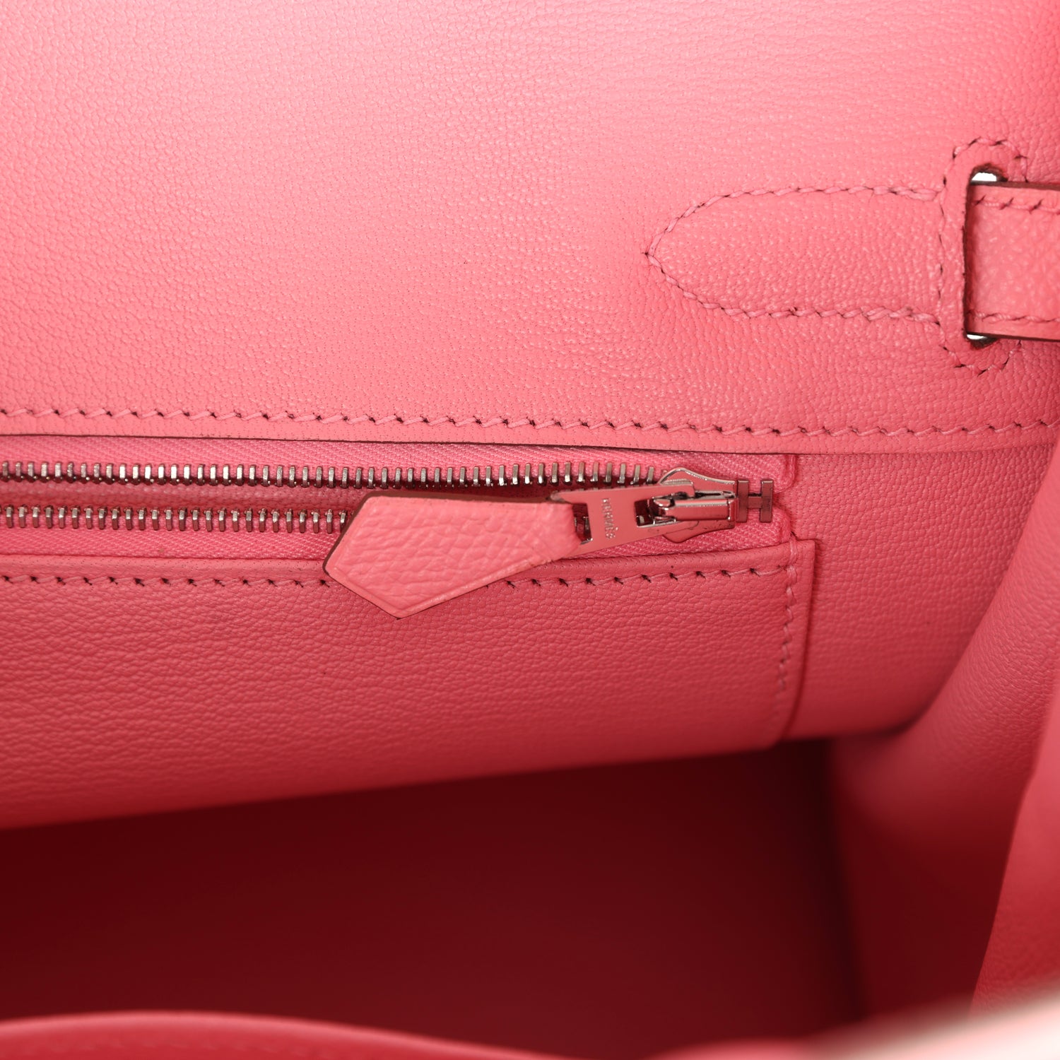 The interior is lined with Rose Confetti chevre and has a zip pocket with an Hermes engraved zipper pull and an open pocket on the opposite side.