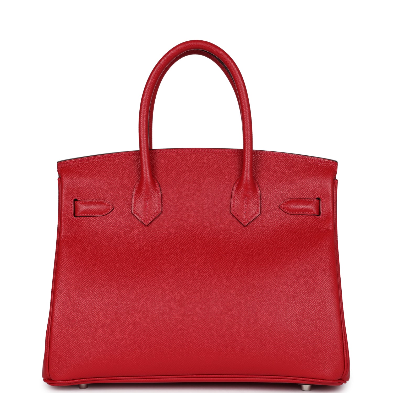 This Birkin is in Rouge Casaque epsom leather with palladium hardware and has tonal stitching, front flap, two straps with center toggle closure, clochette with lock and two keys, and double rolled handles.