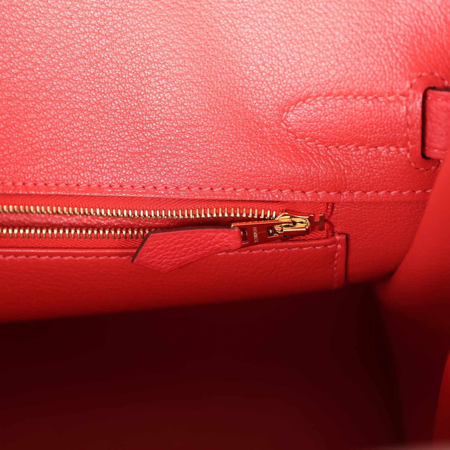 This Birkin is inRouge Pivoine togo leather with gold hardware and has tonal stitching, front flap, two straps with center toggle closure, clochette with lock and two keys, and double rolled handles.