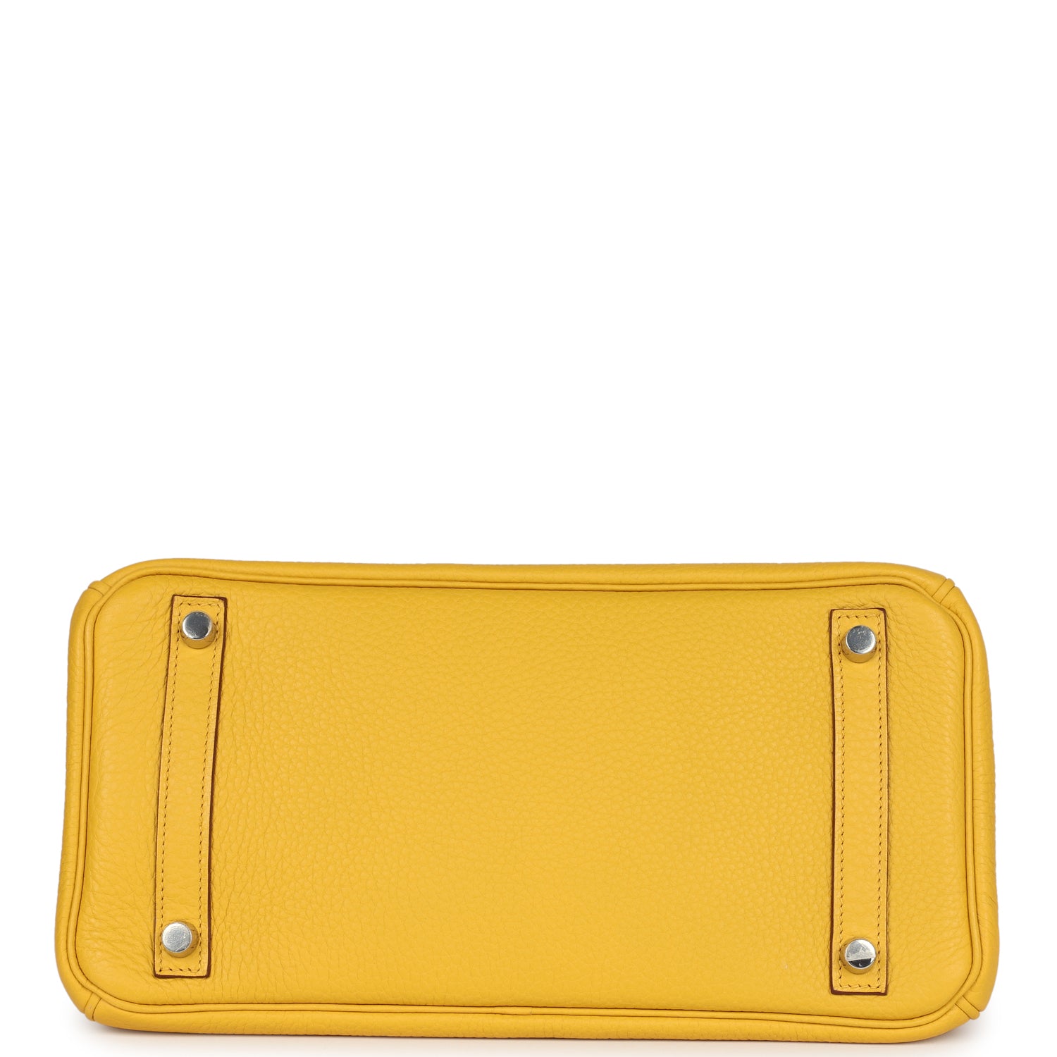 This Birkin is in Soleil clemence leather with palladium hardware, and has tonal stitching, front flap with two straps, front toggle closure, clochette with lock and two keys, and double rolled handles.