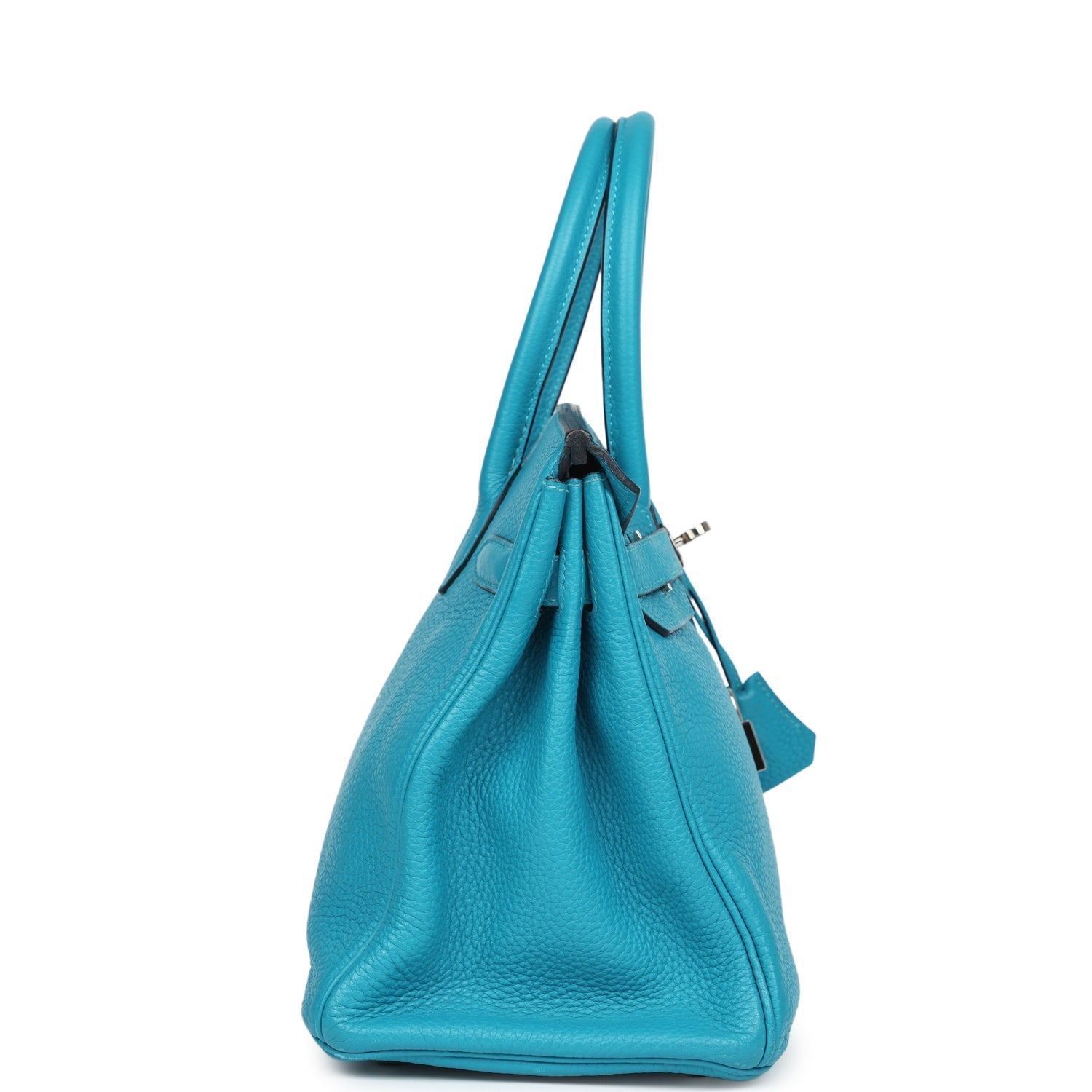 ThisBirkin is in Turquoise clemence leather with palladium hardware, and has tonal stitching, front flap with two straps, front toggle closure, clochette with lock and two keys, and double rolled handles.