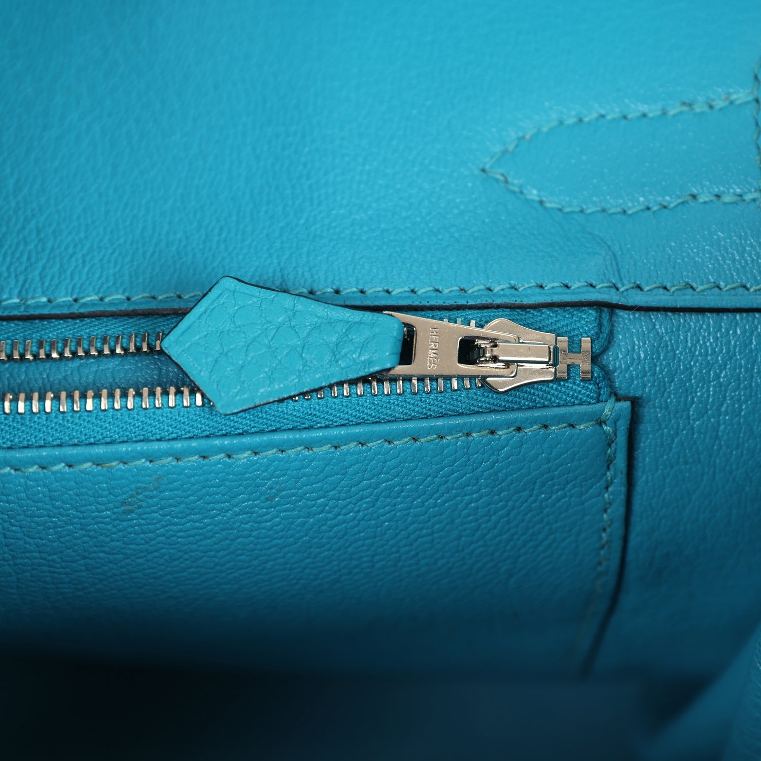 The interior is lined in Turquoise chevre leather and has one zip pocket with Hermes engraved pull; pocket on opposite side.