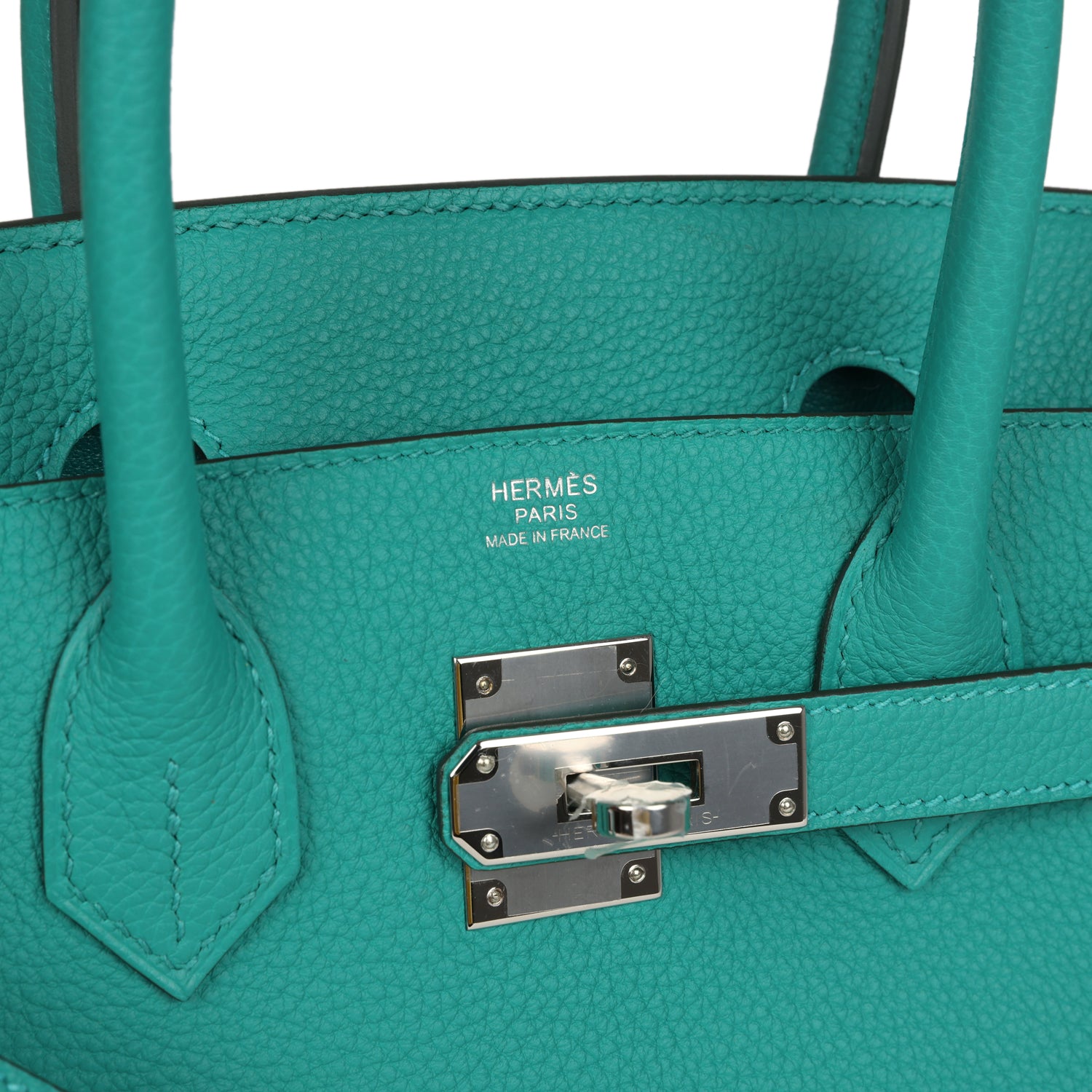 This Birkin is in Vert Verone togo leather with palladium hardware, tonal stitching, front flap with two straps, front toggle closure, clochette with lock and two keys, and double rolled handles.