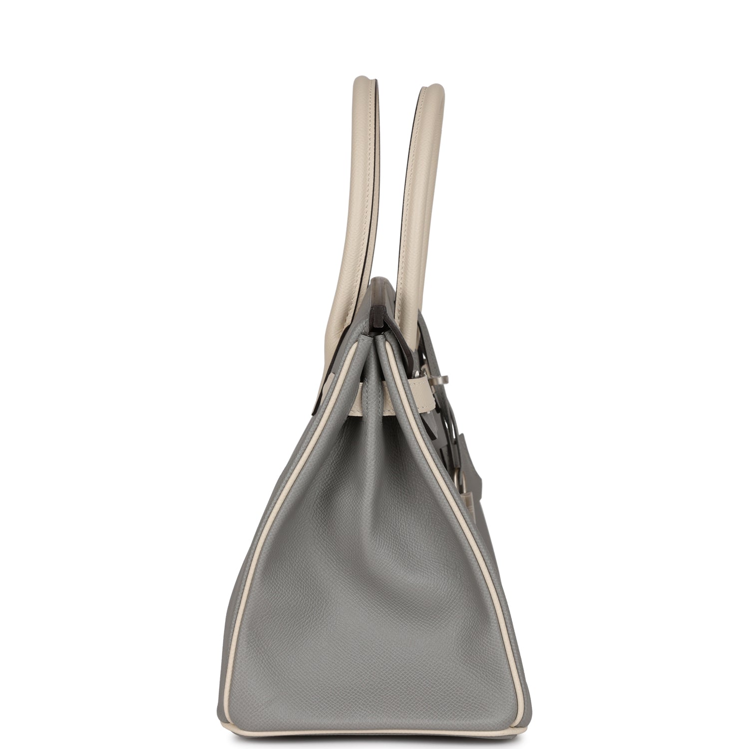 This Special Order Birkin is in Gris Mouette and Craie Epsom leather with Brushed Palladium Hardware, lined in craie chevre leather, tonal stitching, front flap with two straps, front toggle closure, clochette with lock and two keys, double rolled handles.