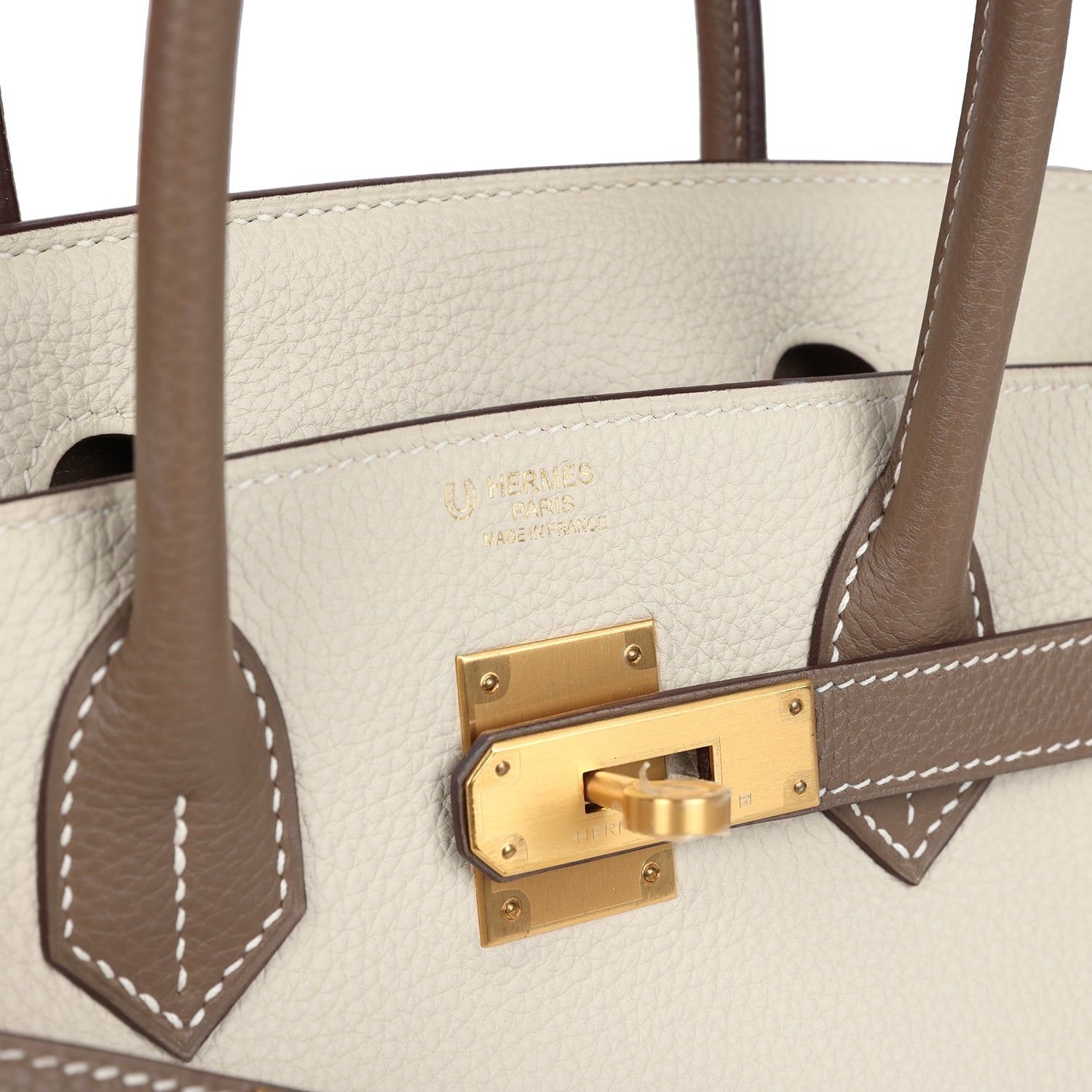 This Special Order Birkin is in Craie and Etoupe togo leather with brushed gold hardware, features contrast and tonal stitching, front flap, two straps with center toggle closure, clochette with lock and two keys, and double rolled handles.