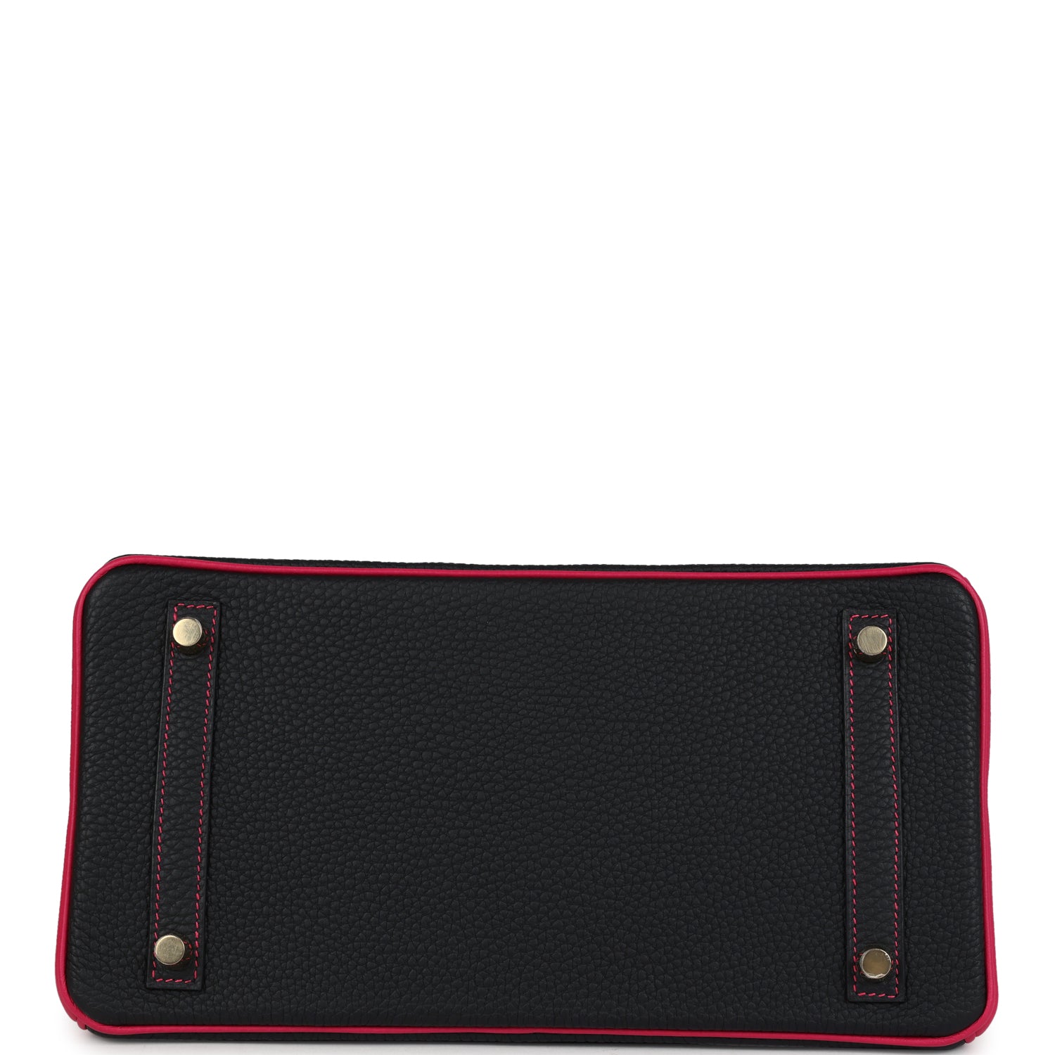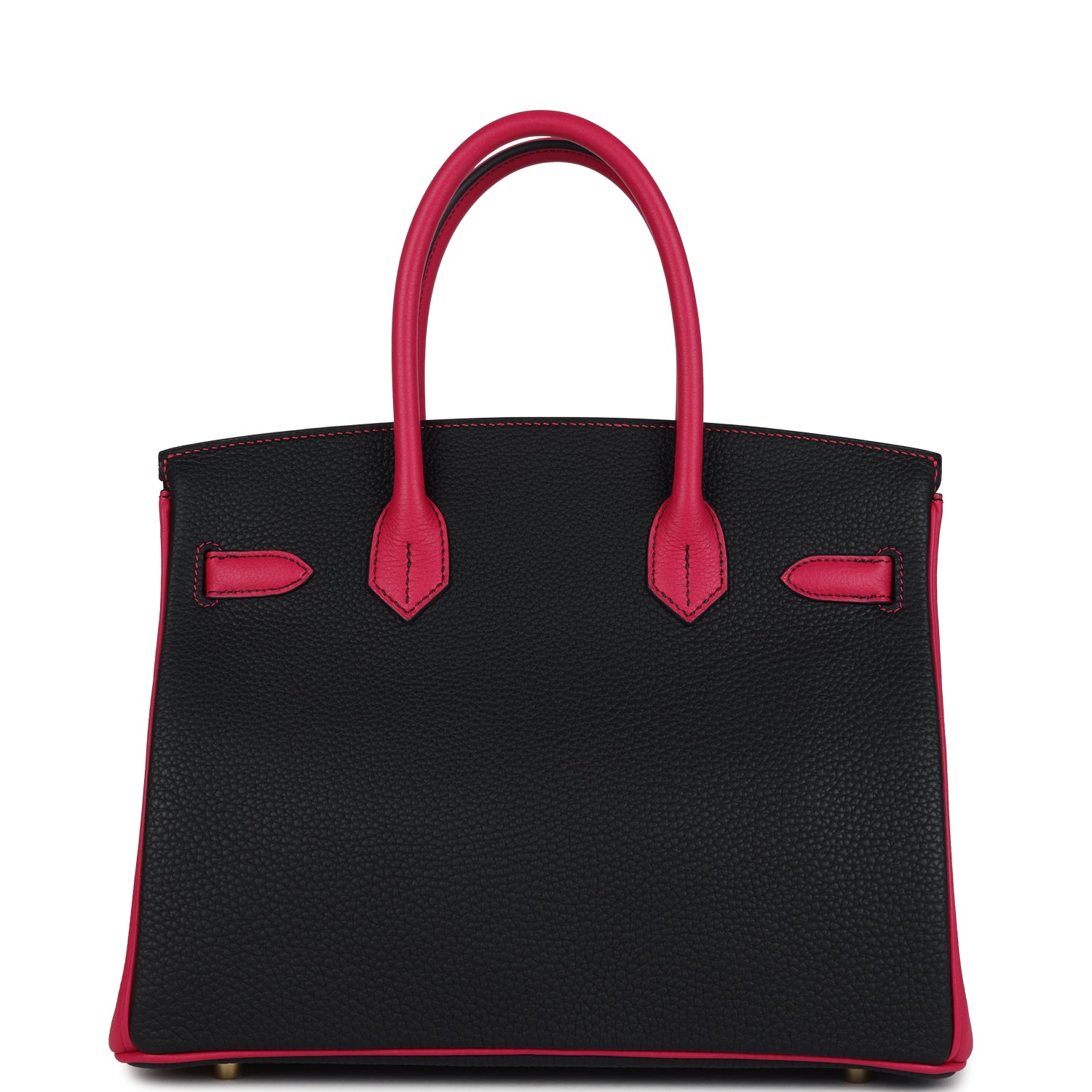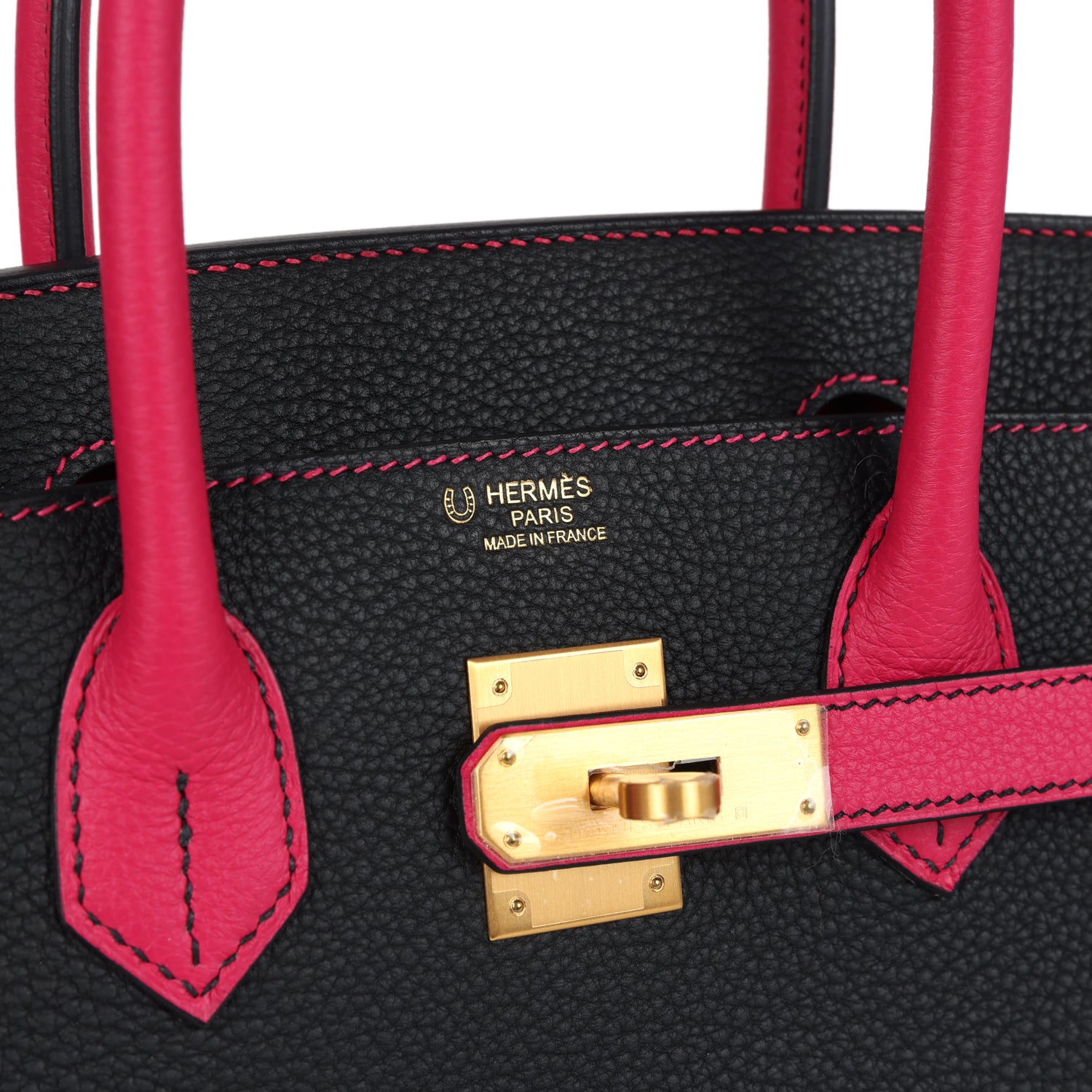 This Special Order Birkin is in Black and Rose Mexico togo leather with brushed gold hardware, features contrast stitching, front flap, two straps with center toggle closure, clochette with lock and two keys, and double rolled handles.