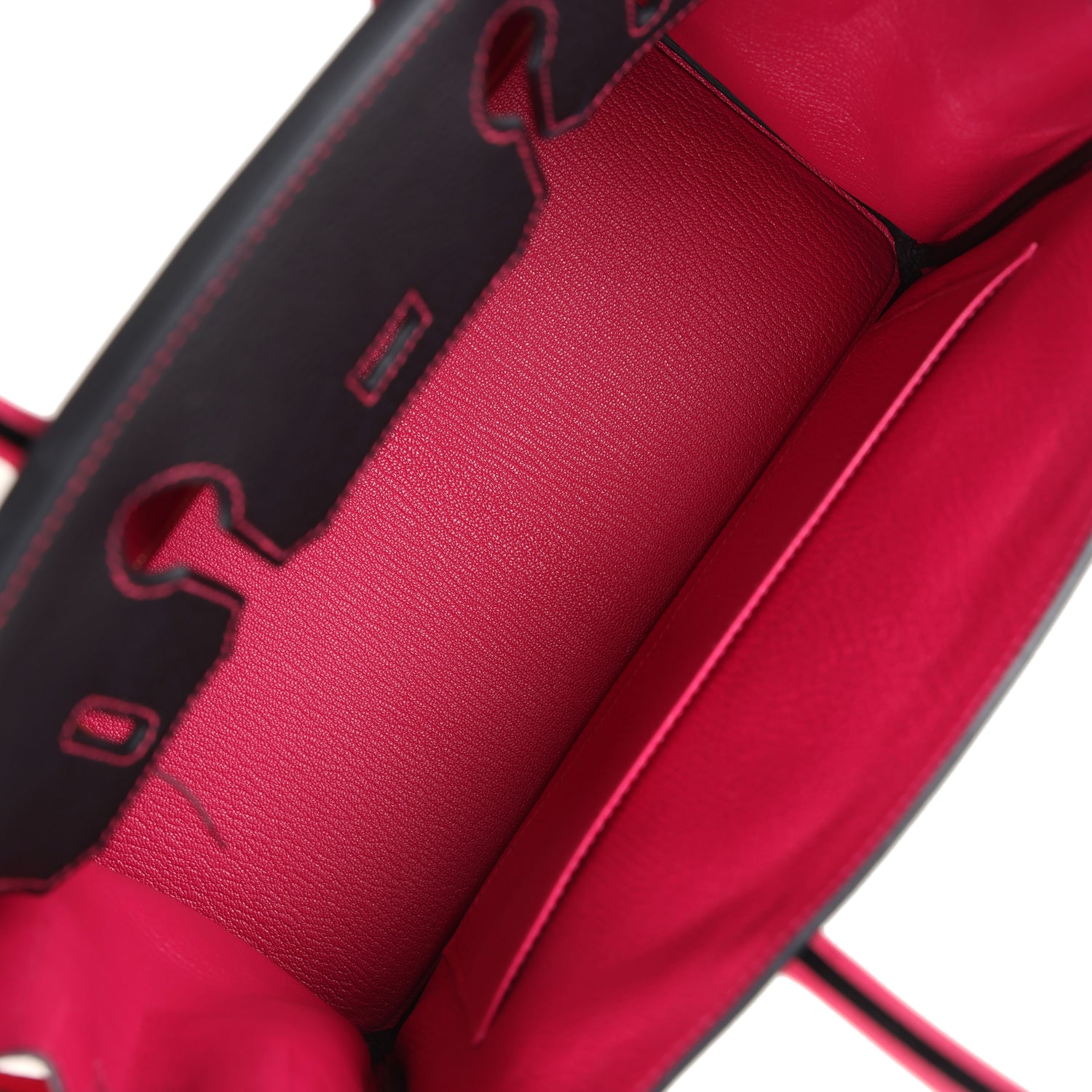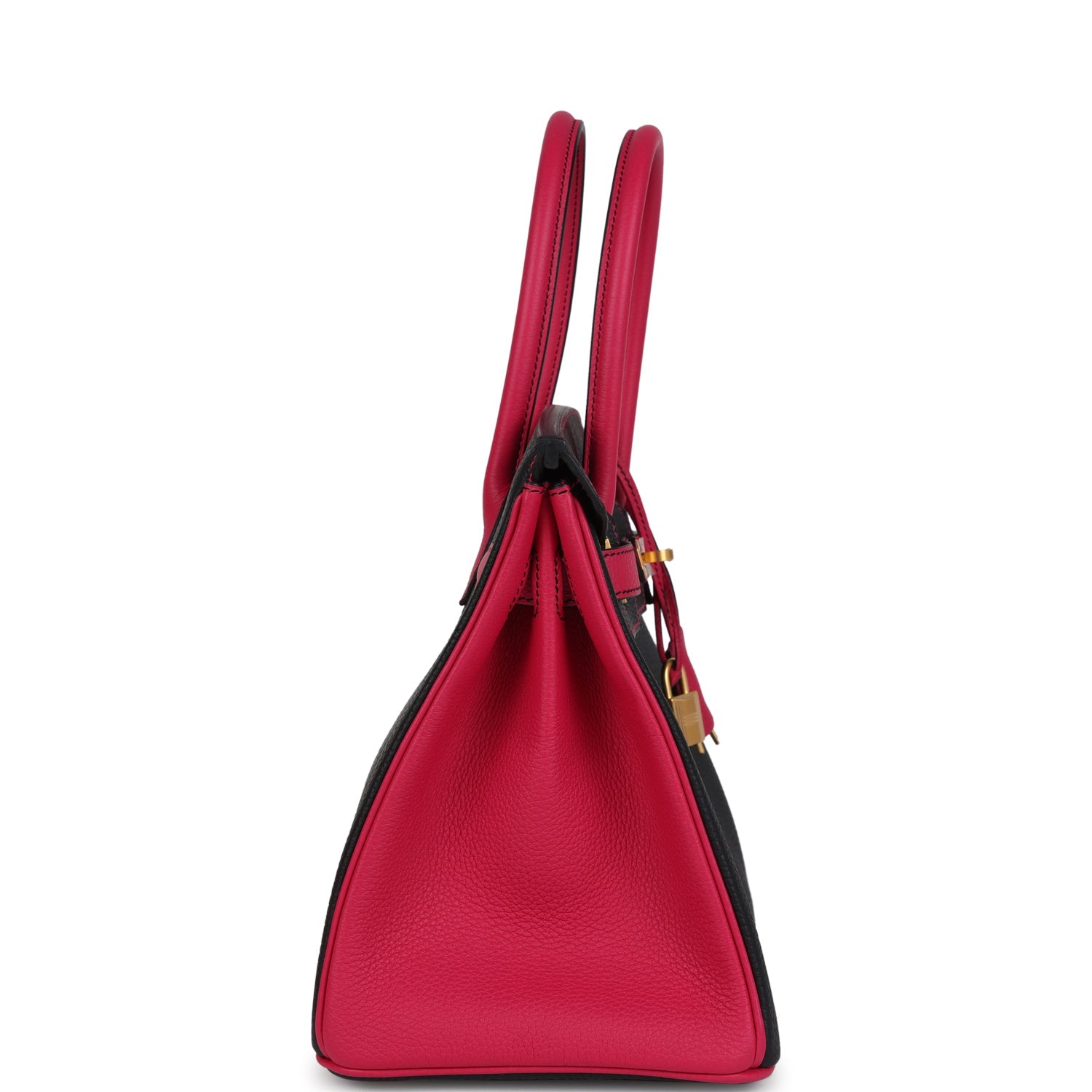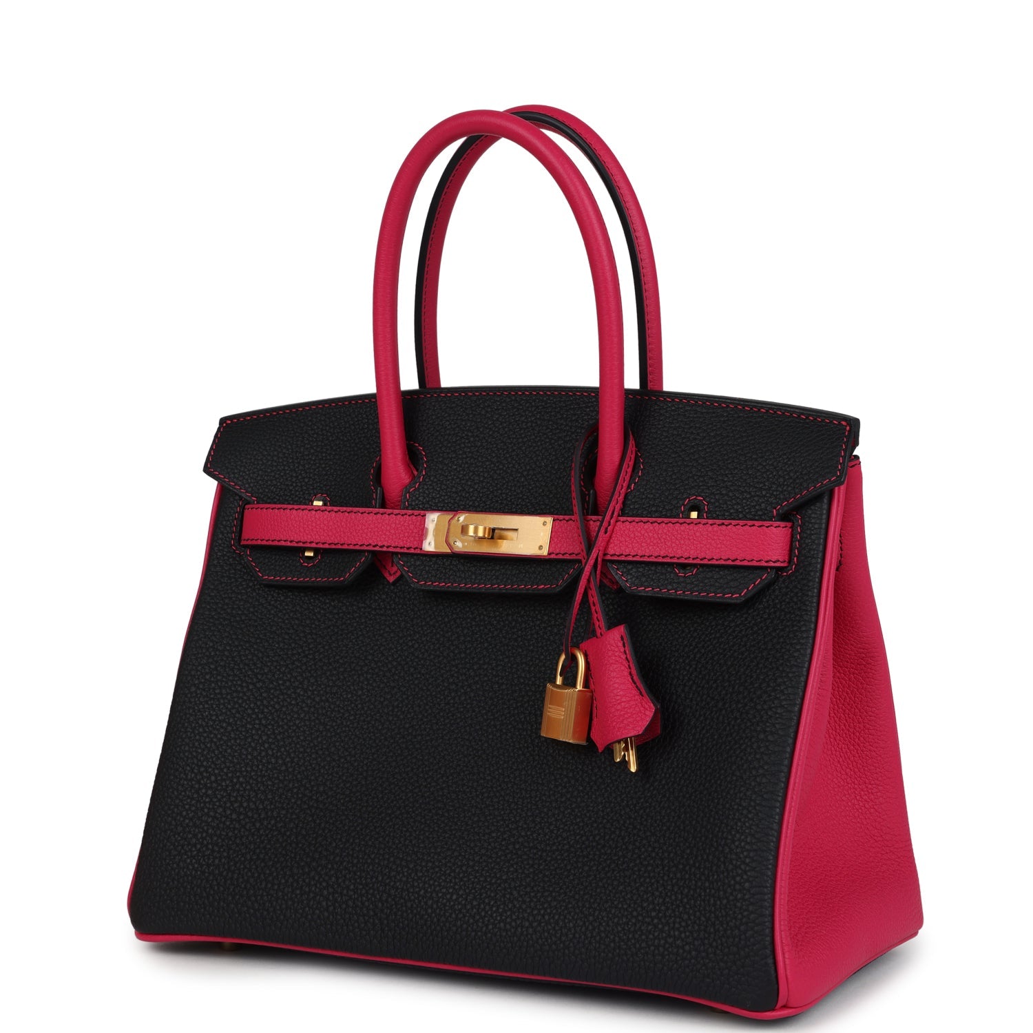 This Special Order Birkin is in Black and Rose Mexico togo leather with brushed gold hardware, features contrast stitching, front flap, two straps with center toggle closure, clochette with lock and two keys, and double rolled handles.
