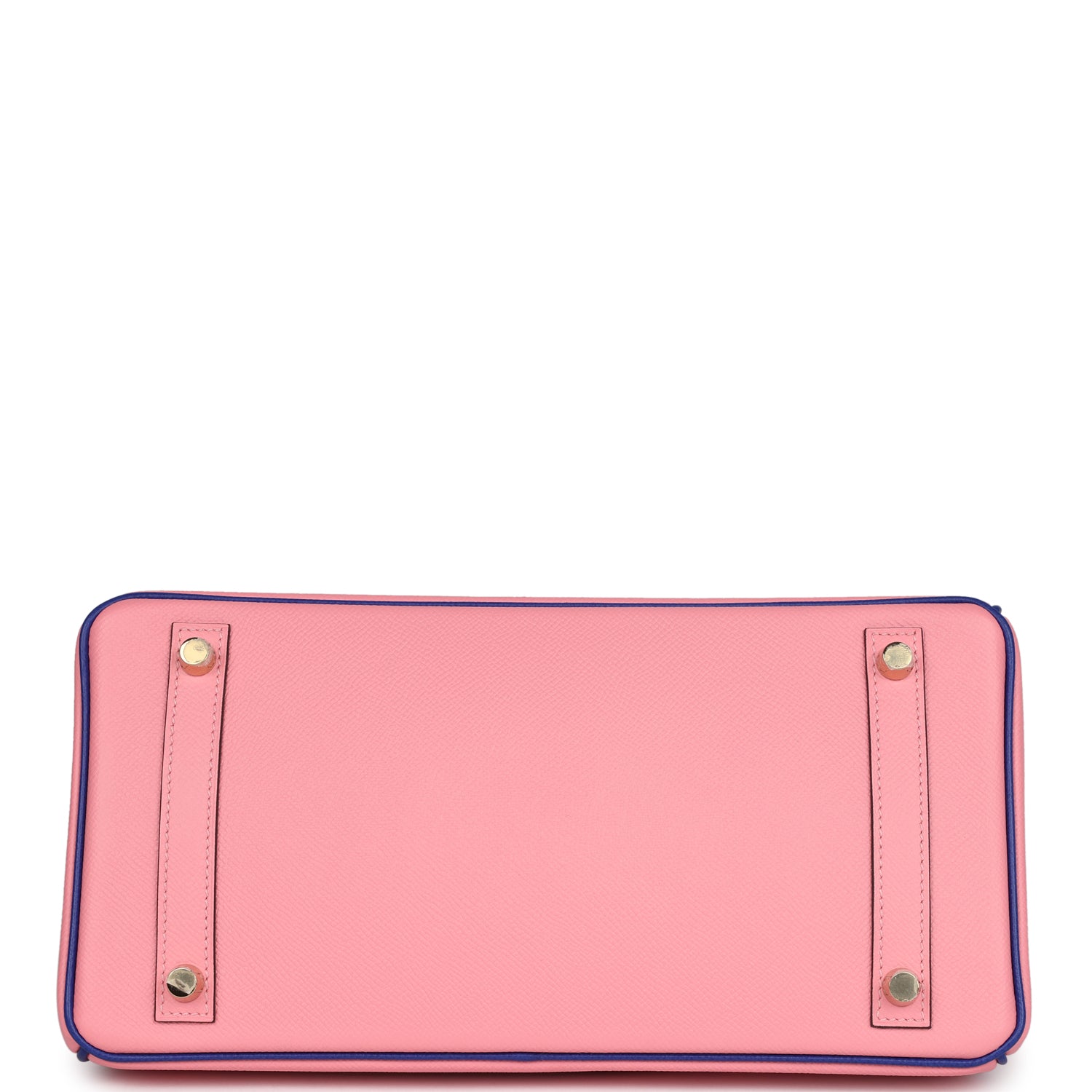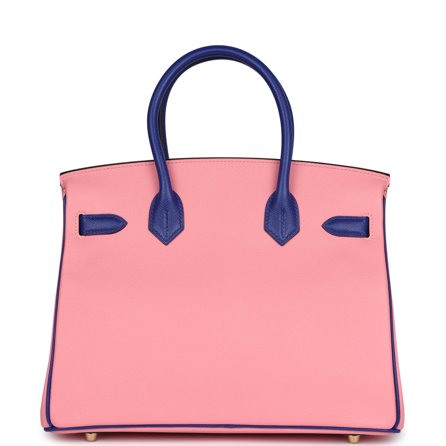 This Special Order Birkin is in Rose Confetti and Bleu Electric epsom leather with brushed gold hardware and has tonal stitching, front flap, two straps with center toggle closure, clochette with lock and two keys, and double rolled handles.