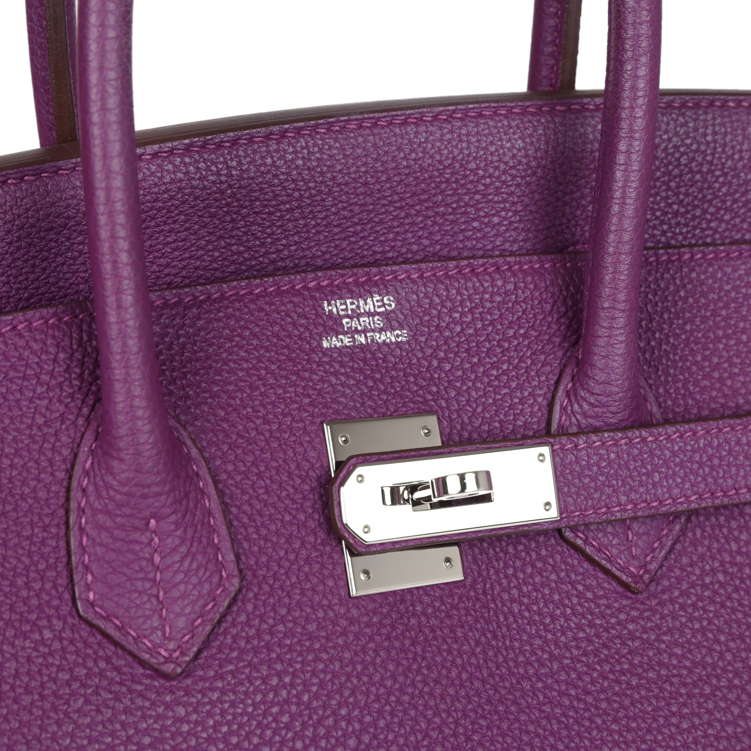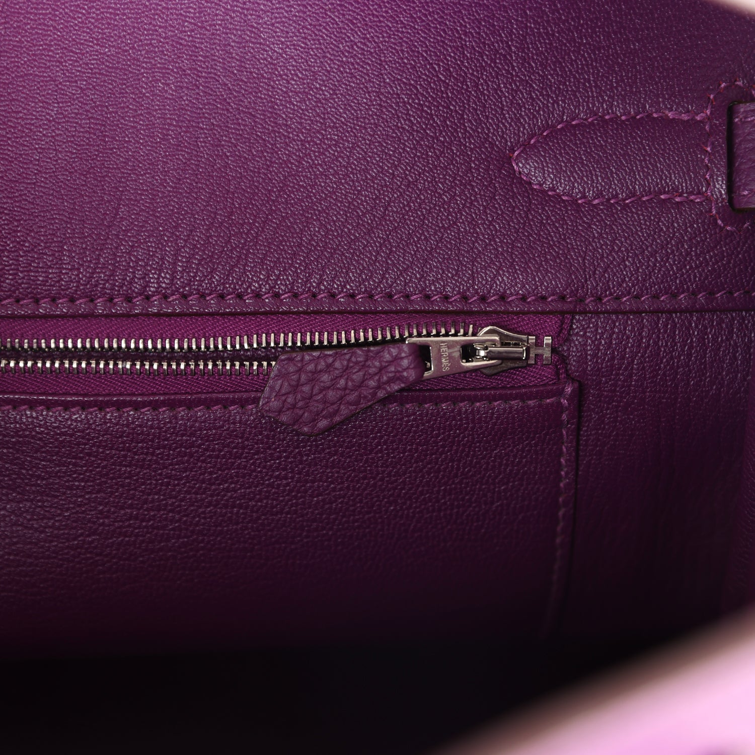 This Birkin is in Anemone togo leather with palladium hardware, tonal stitching, front flap with two straps, front toggle closure, clochette, lock and 2 keys and double rolled handles.