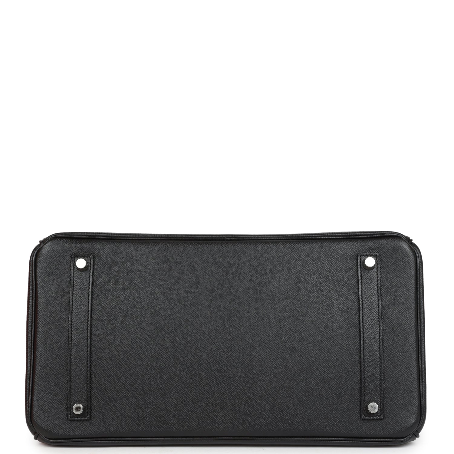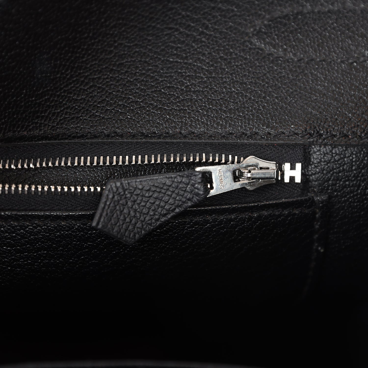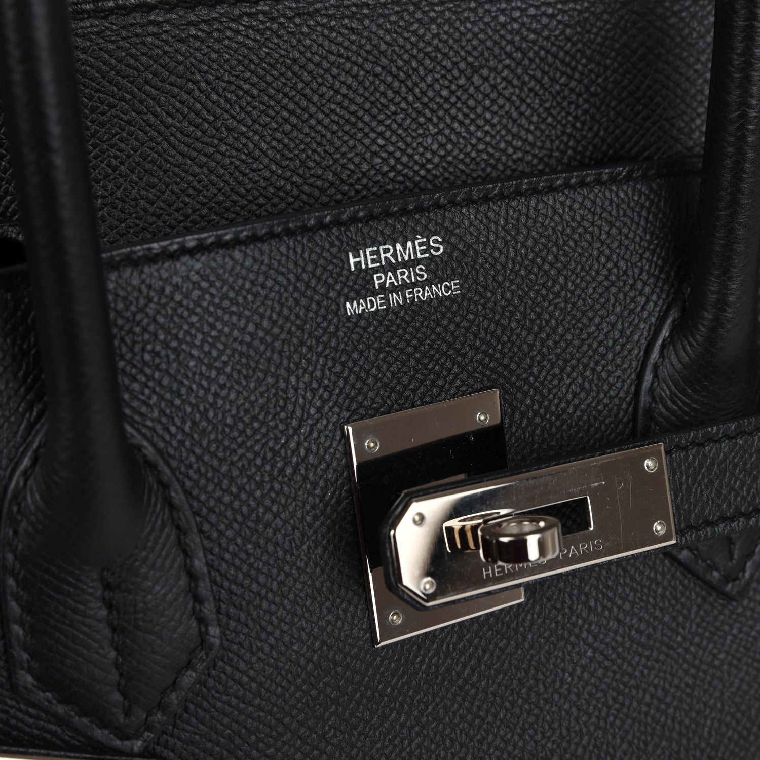This Birkin is in Black epsom leather with palladium hardware and has tonal stitching,front flap, two straps with center toggle closure, clochette with lock and two keys, and double rolled handles.