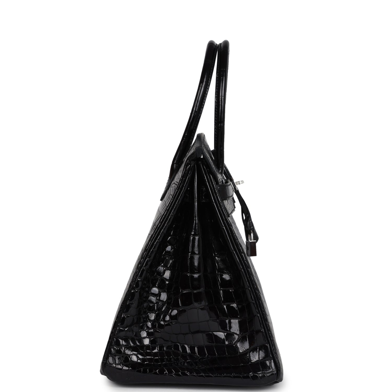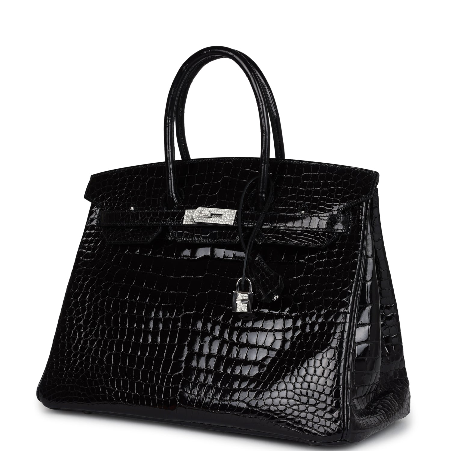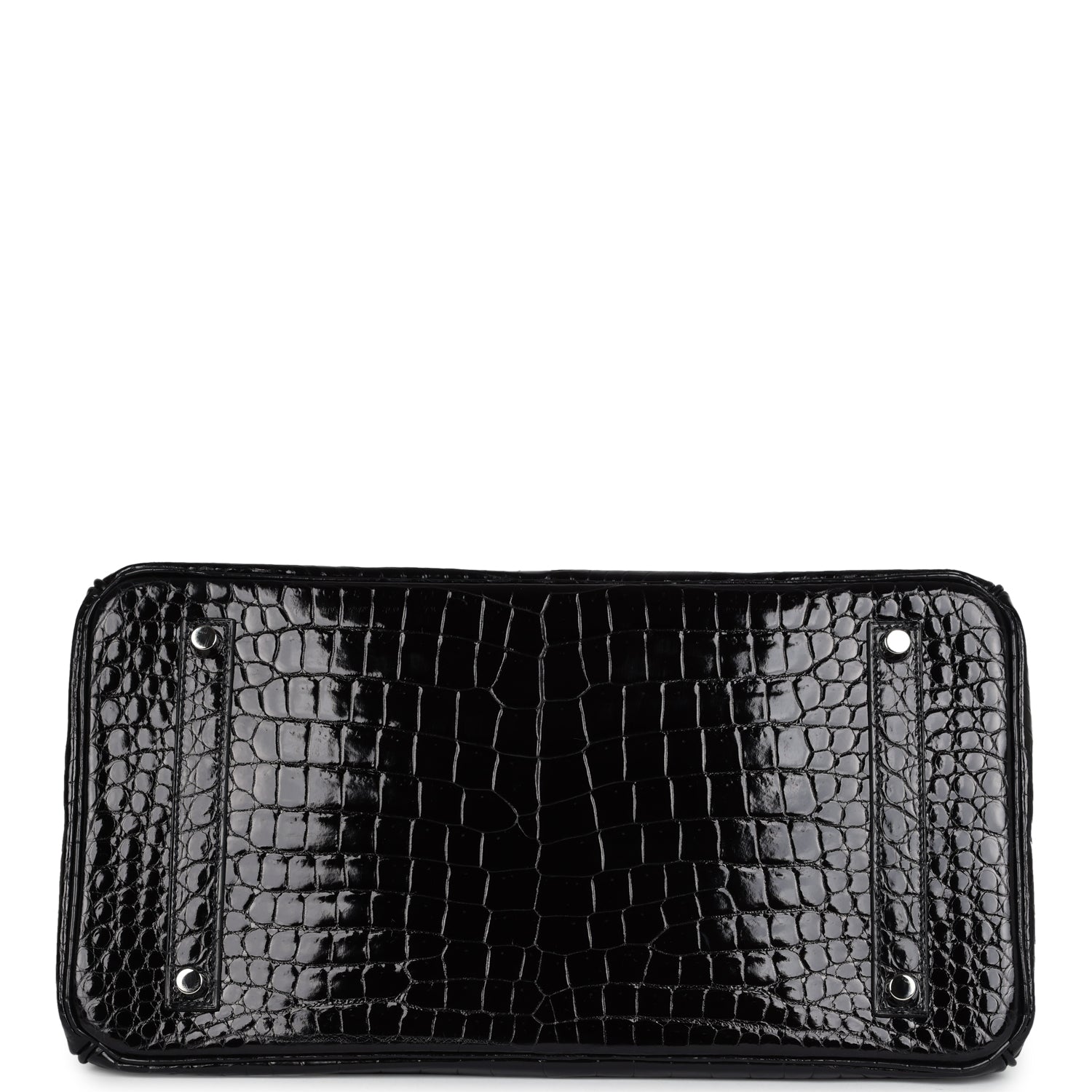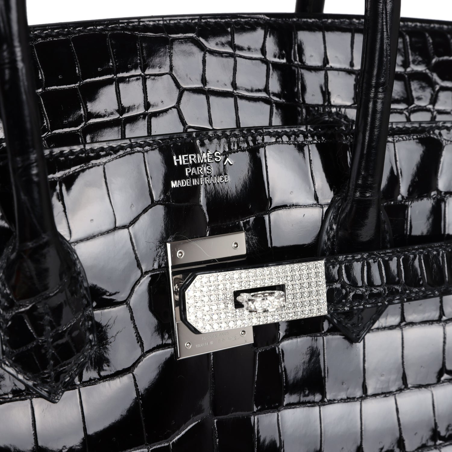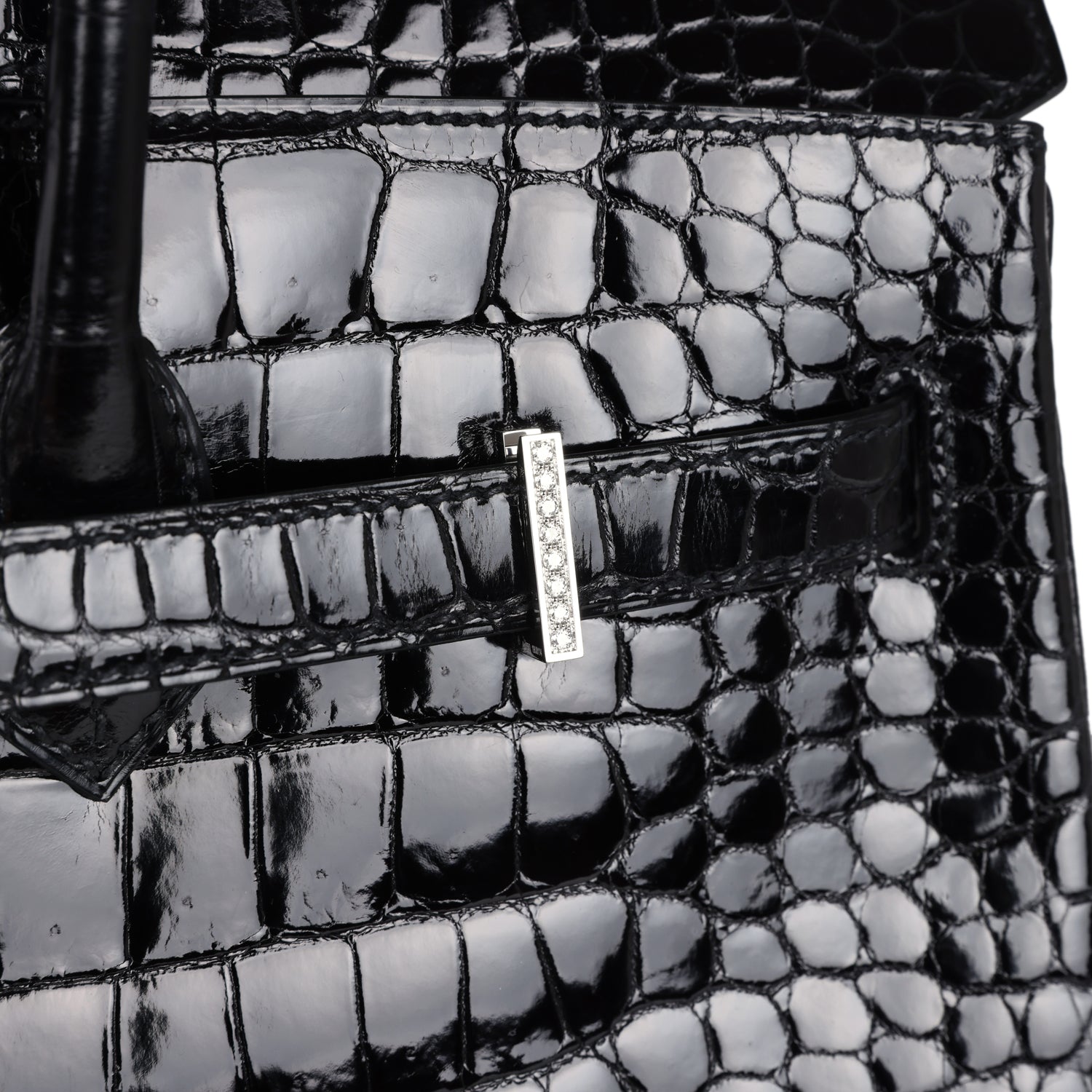This rare Birkin is in Black Shiny Porosus Crocodile leather with 18K white gold diamond encrusted hardware and has tonal stitching, front flap, two straps with center toggle closure, clochette with lock and two keys, and double rolled handles. This Birkin features pull strap plaques, front toggle closure and lock encrusted with 18k white gold and a total of 245 diamonds.