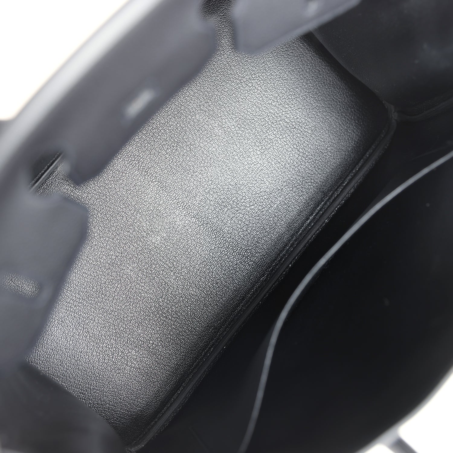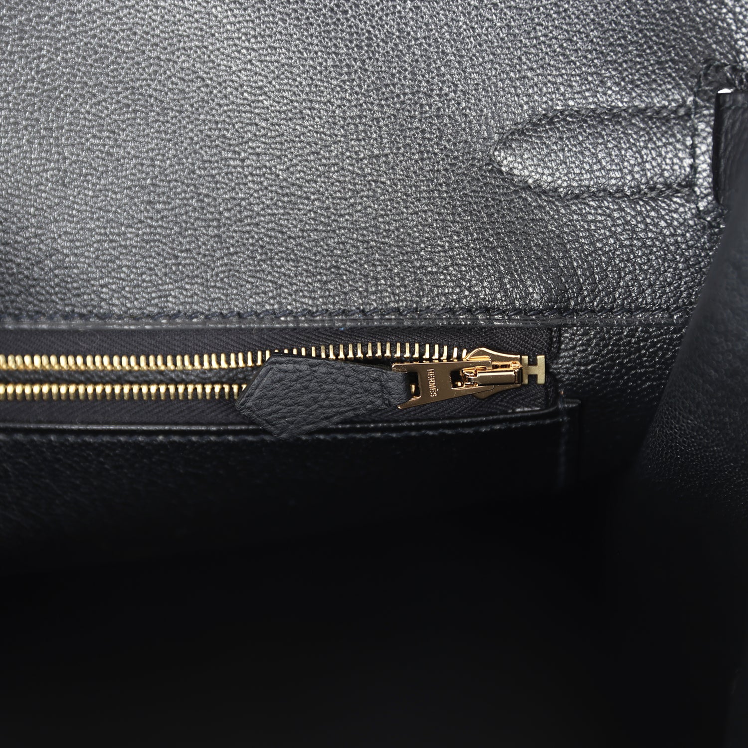 The interior is lined with Black chevre and has one zip pocket with an Hermes engraved zipper pull and an open pocket on the opposite side.