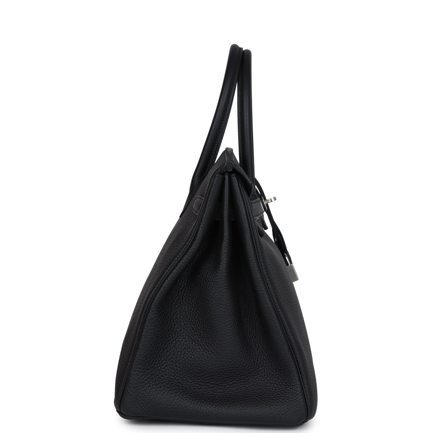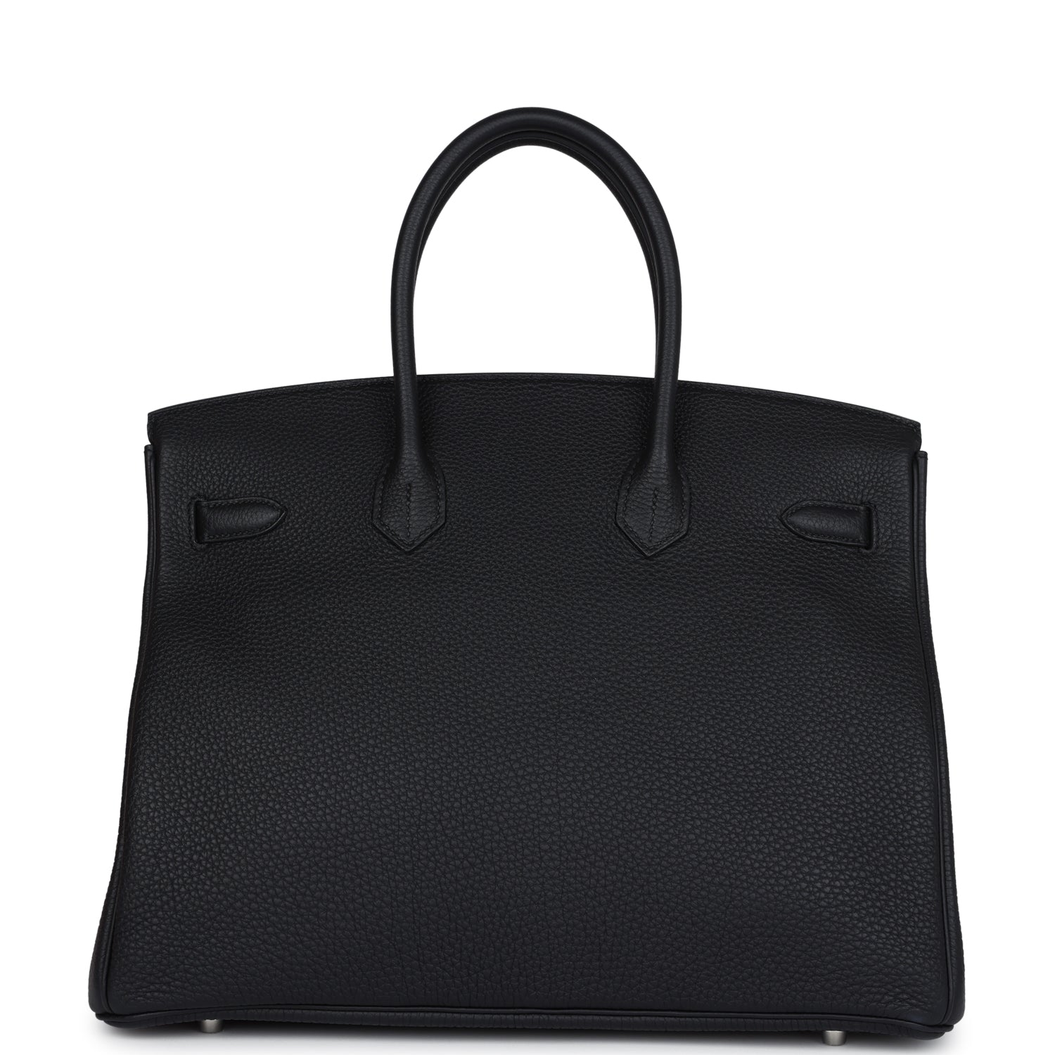 This Birkin is in Black togo leather with palladium hardware and has tonal stitching, front flap, two straps with center toggle closure, clochette with lock and two keys, and double rolled handles.