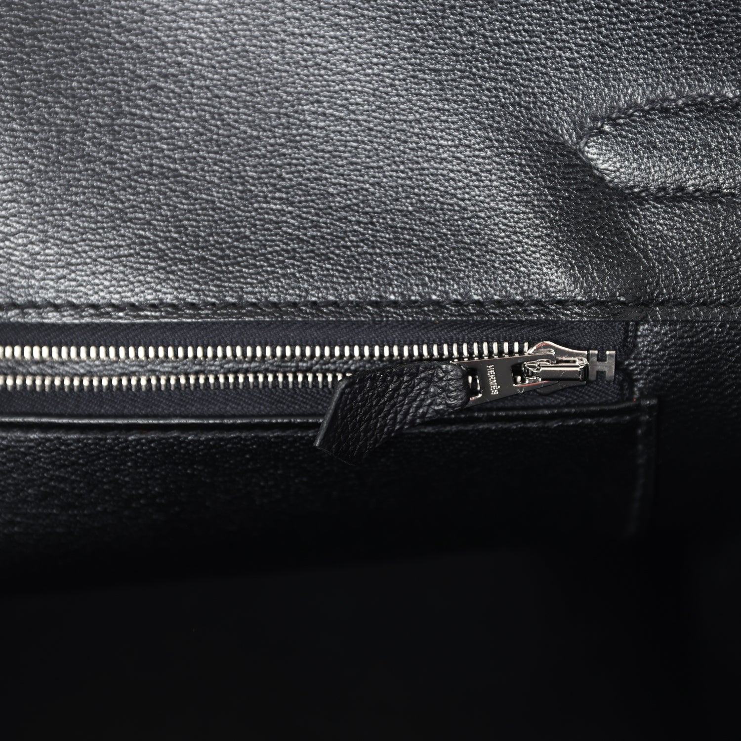 The interior is lined with Black chevre and has one zip pocket with an Hermes engraved zipper pull and an open pocket on the opposite side.