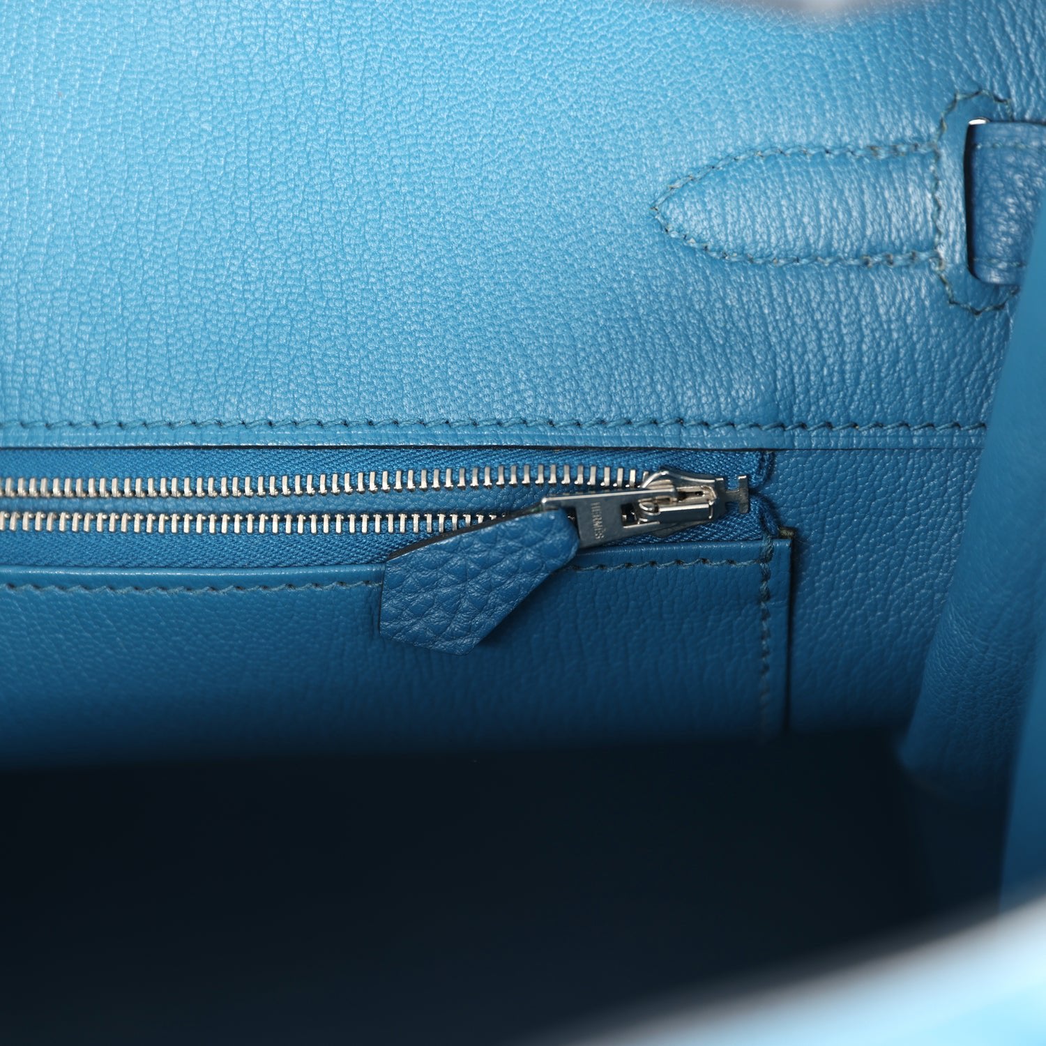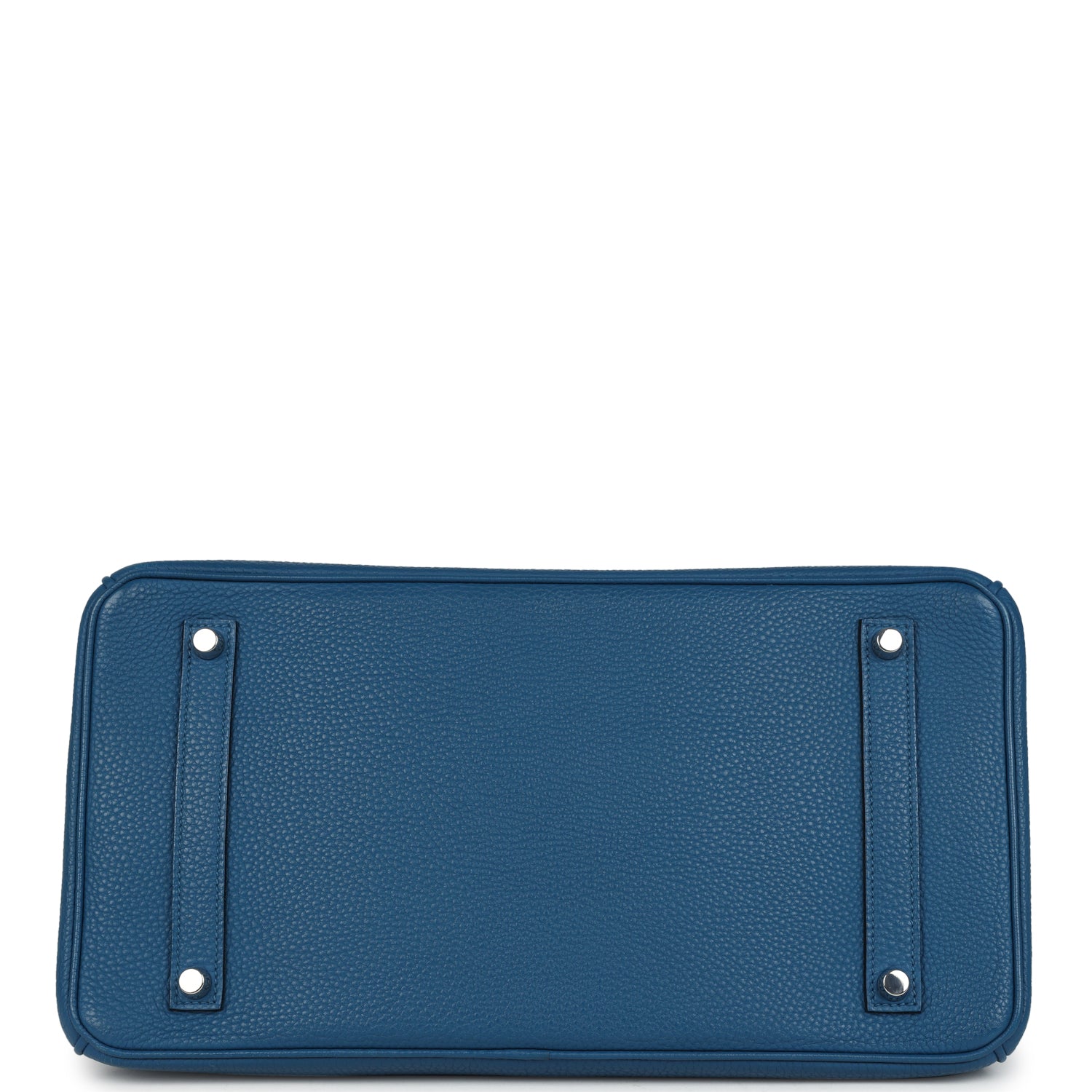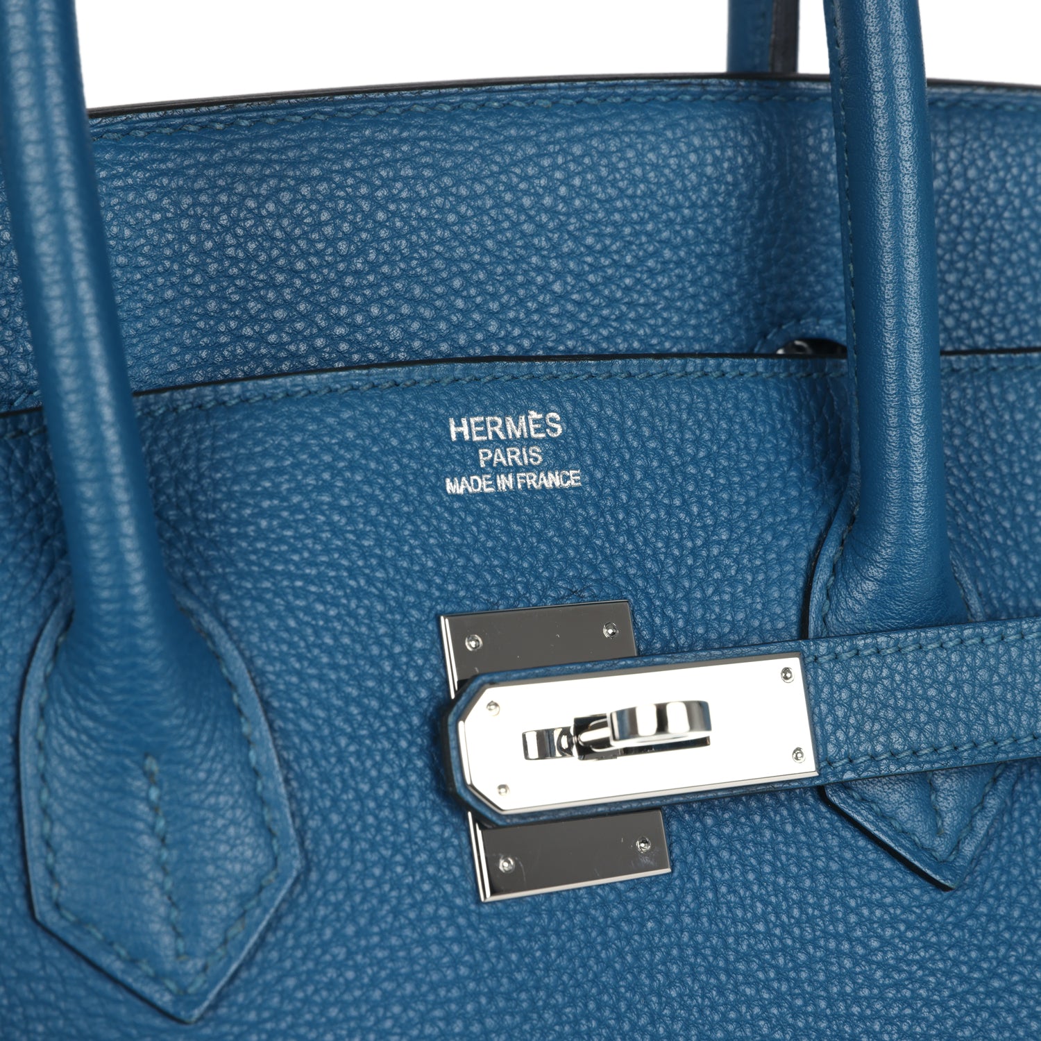 ThisBirkin is Bleu De Galice togo leather with palladium hardware and has tonal stitching, front flap, two straps with center toggle closure, clochette with lock and two keys, and double rolled handles.