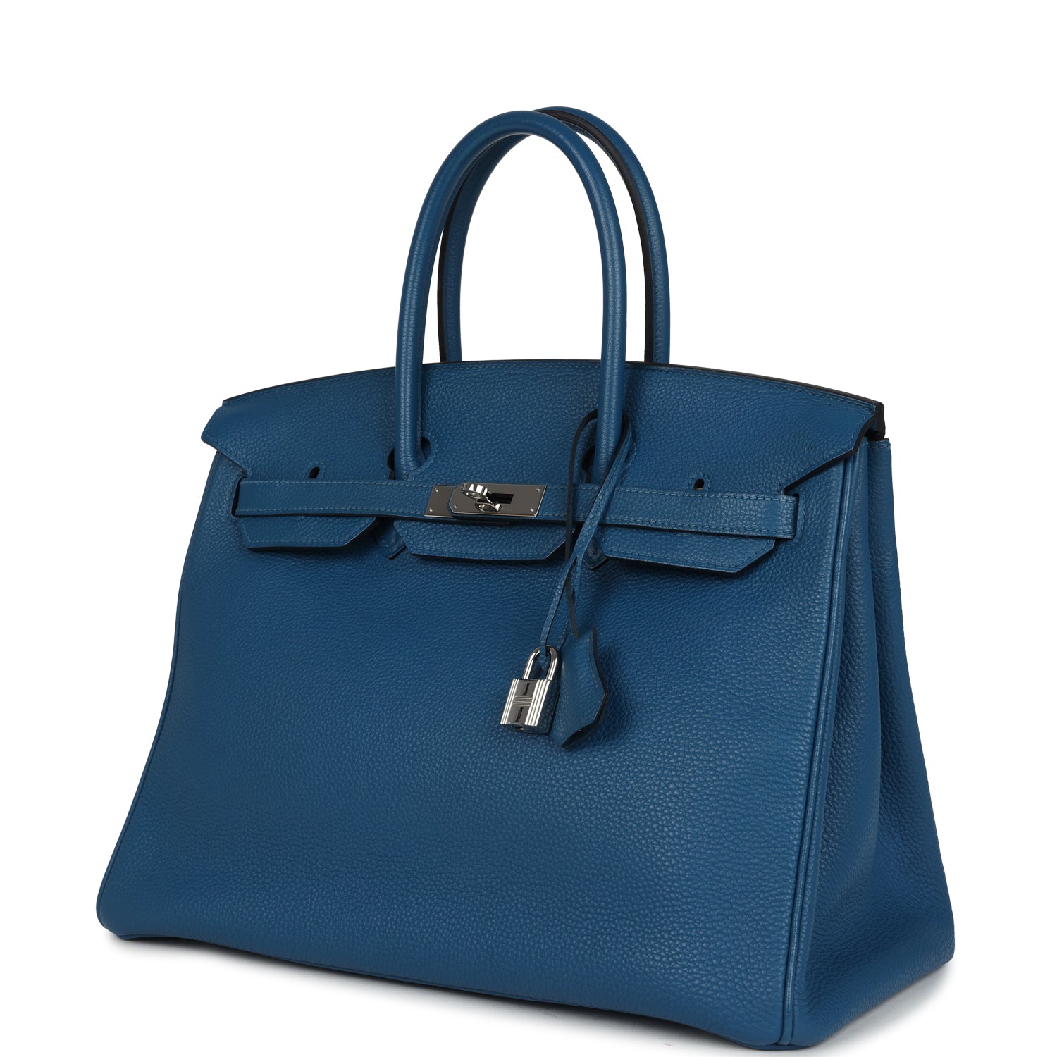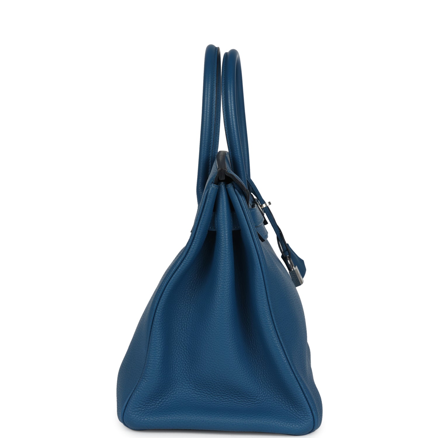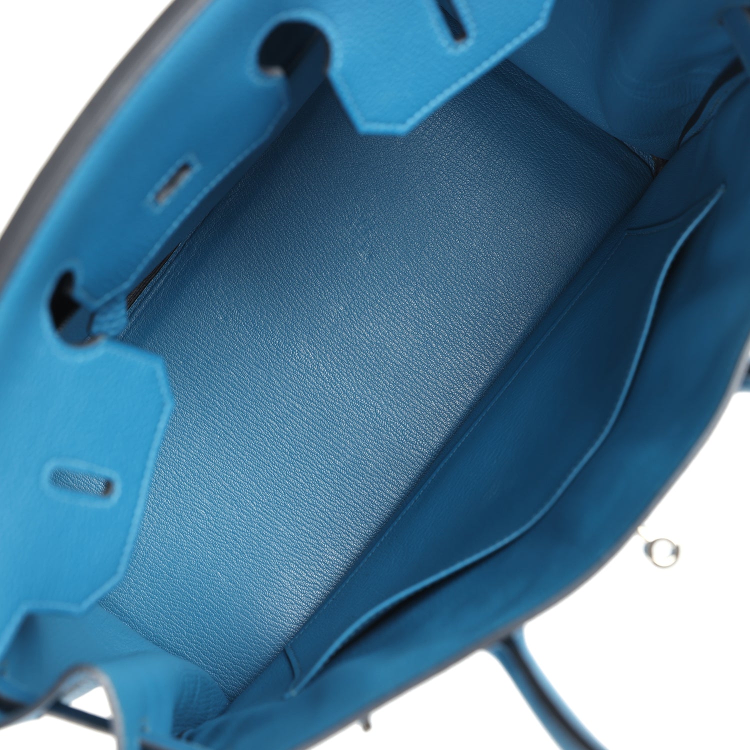 ThisBirkin is Bleu De Galice togo leather with palladium hardware and has tonal stitching, front flap, two straps with center toggle closure, clochette with lock and two keys, and double rolled handles.