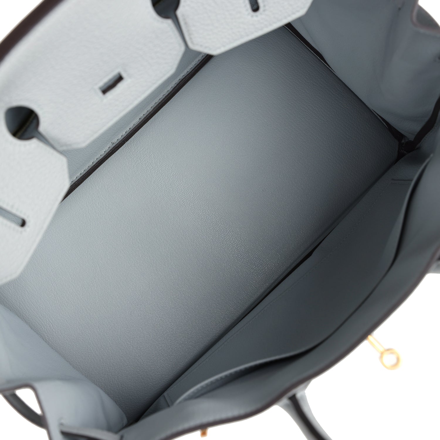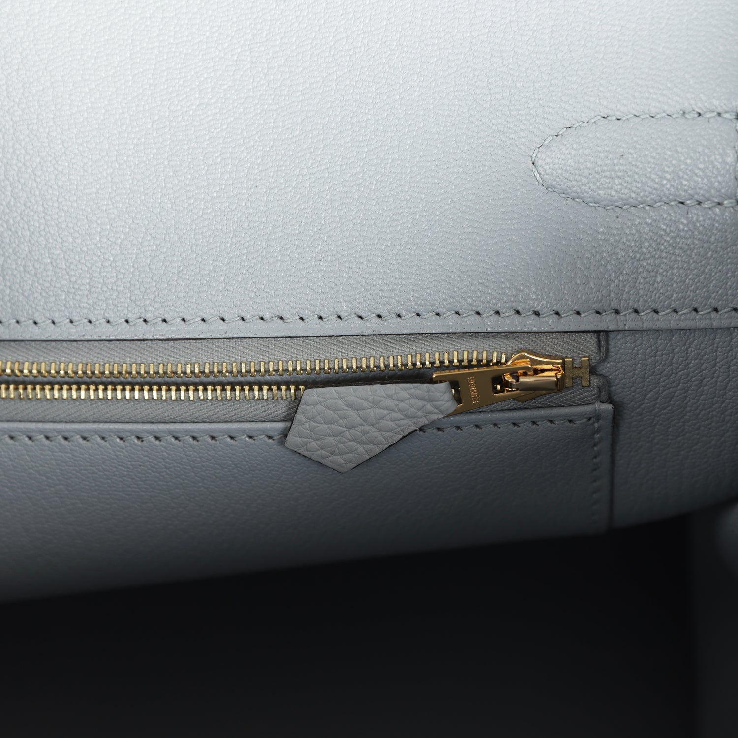 This Birkin is in Bleu Glacier togo leather with gold hardware and has tonal stitching, front flap, two straps with center toggle closure, clochette with lock and two keys, and double rolled handles.