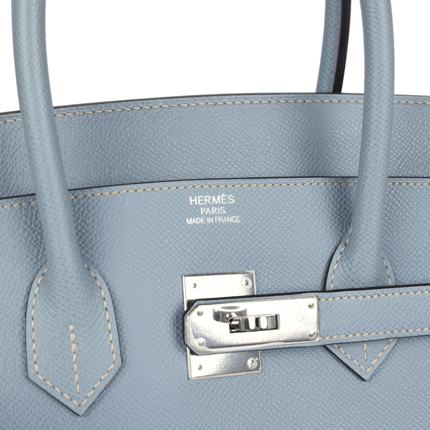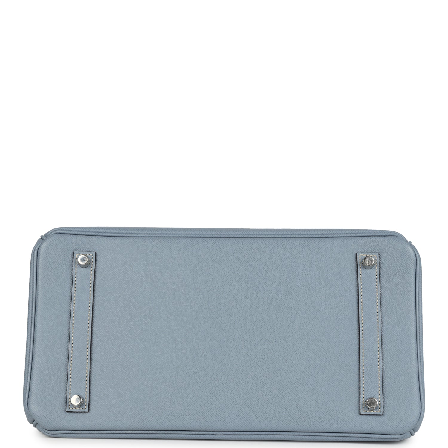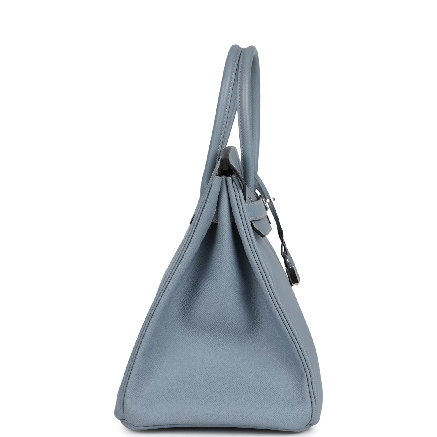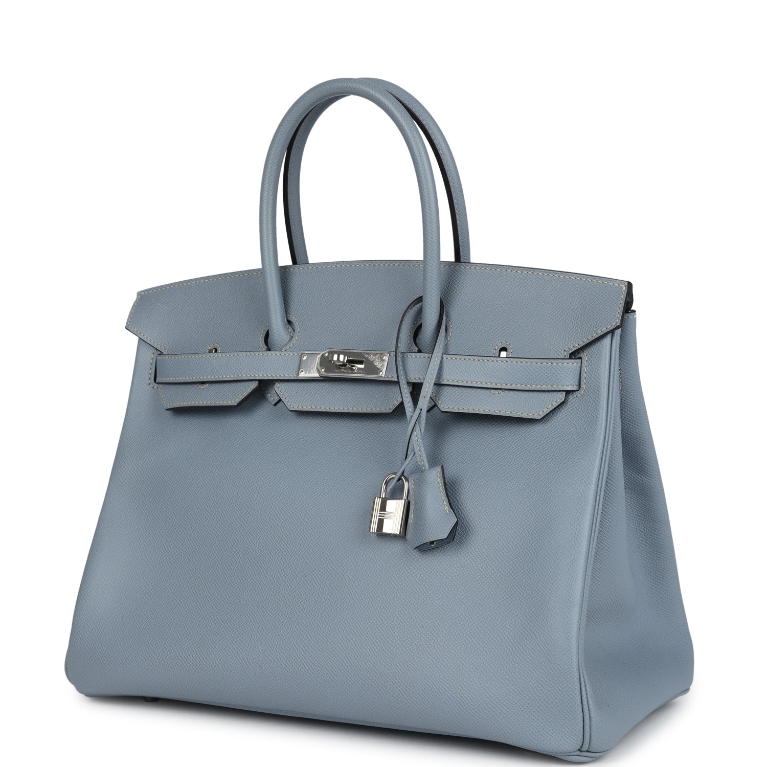 This Birkin is in Bleu Lin epsom leather with palladium hardware and has tonal stitching, front flap, two straps with center toggle closure, clochette with lock and two keys, and double rolled handles.