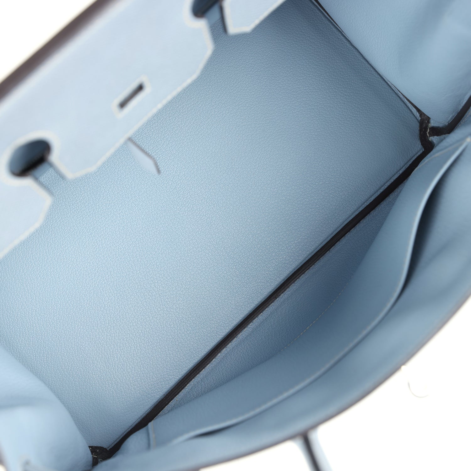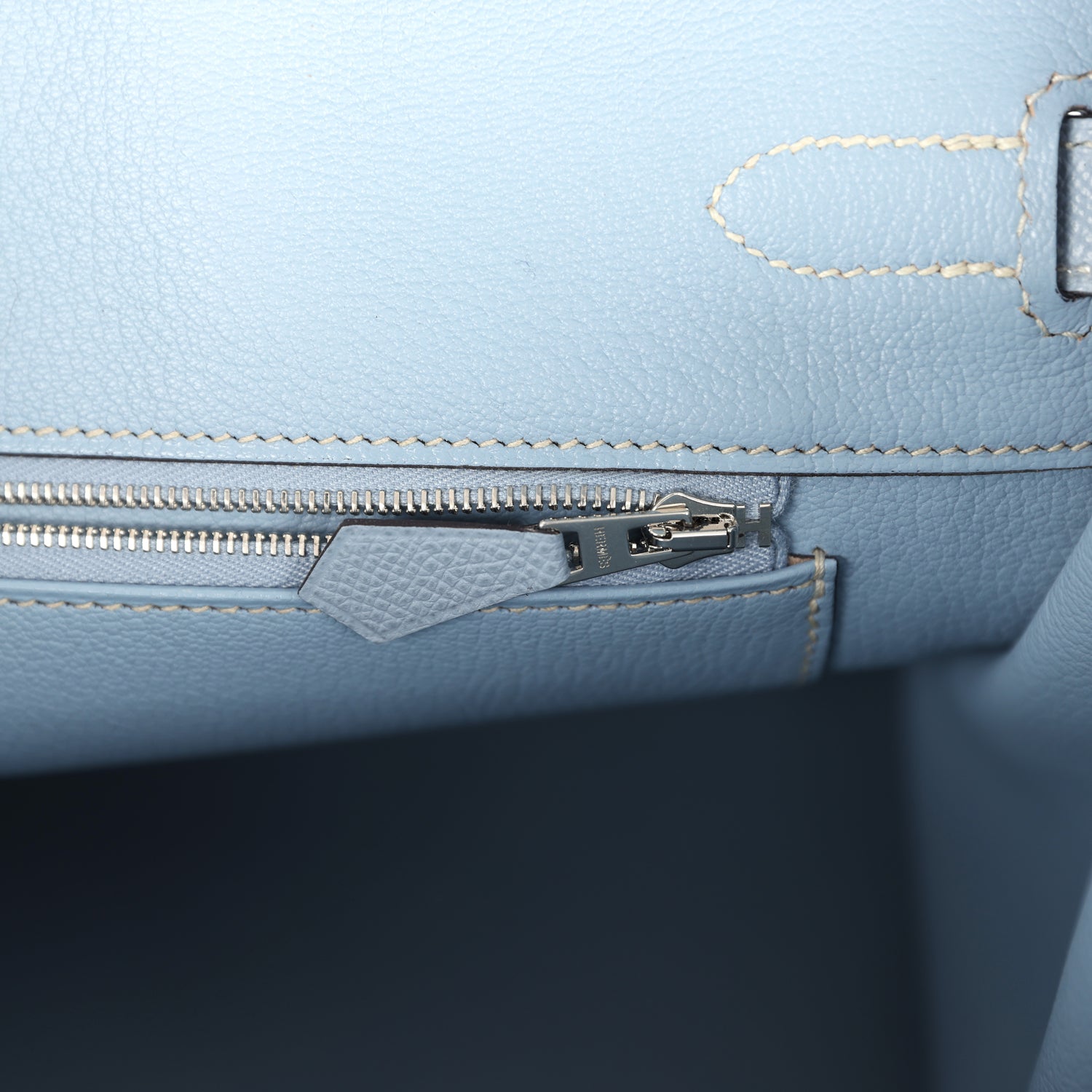 The interior is lined with Bleu Lin chevre and has one zip pocket with an Hermes engraved zipper pull and an open pocket on the opposite side.