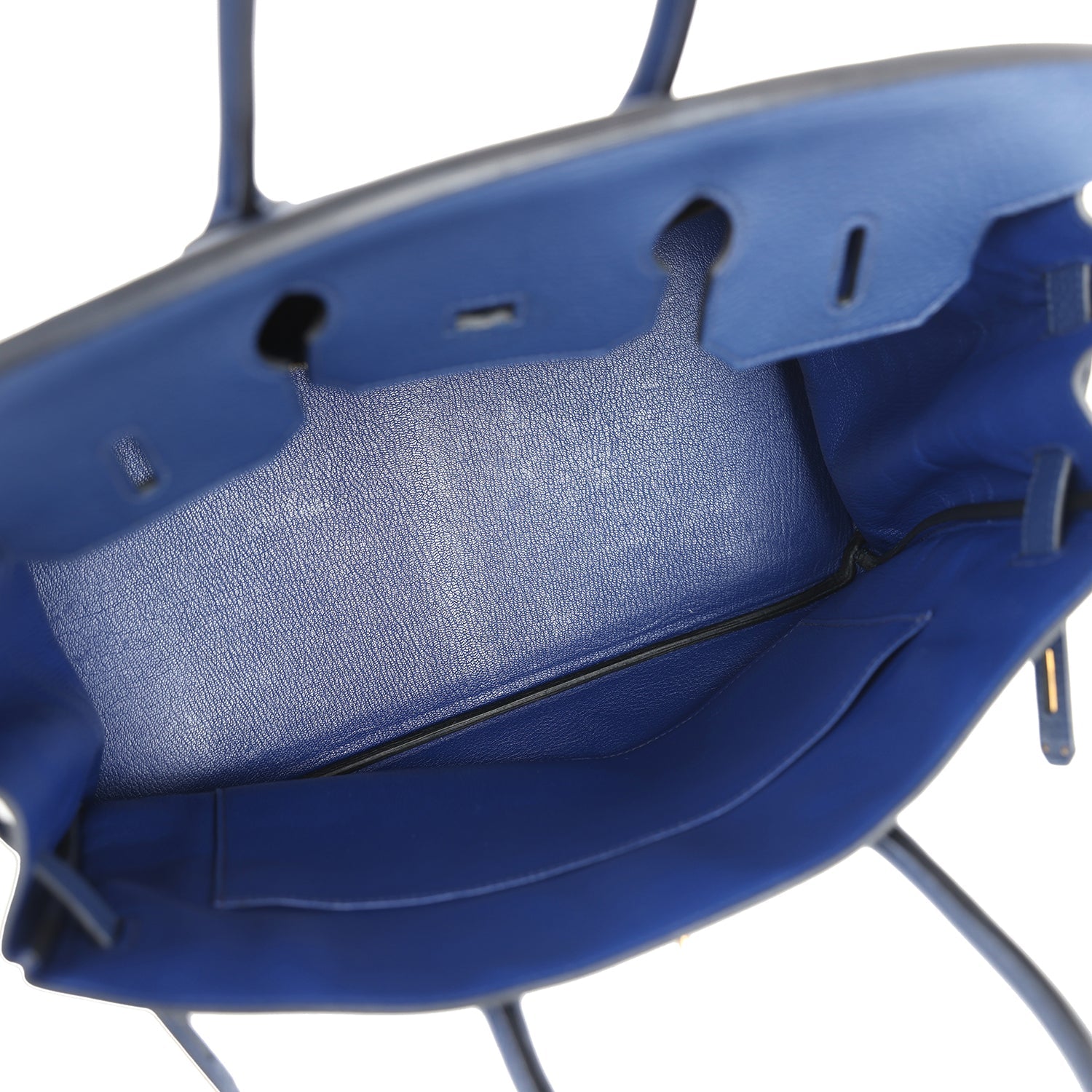 The interior is lined with Bleu Saphir chevre and has one zip pocket with an Hermes engraved zipper pull and an open pocket on the opposite side.